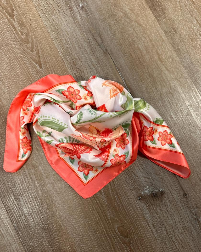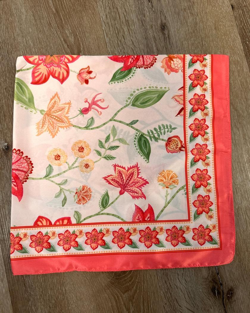 Skjerfet har store og små blomster i nyanser av rosa, rødt og grønt, innrammet av en rosa kant. Med mål på 70 x 70 cm gir det gode muligheter til å style det på forskjellige måter.