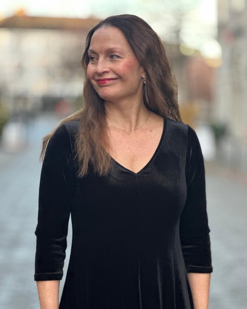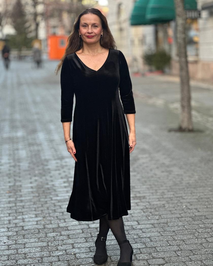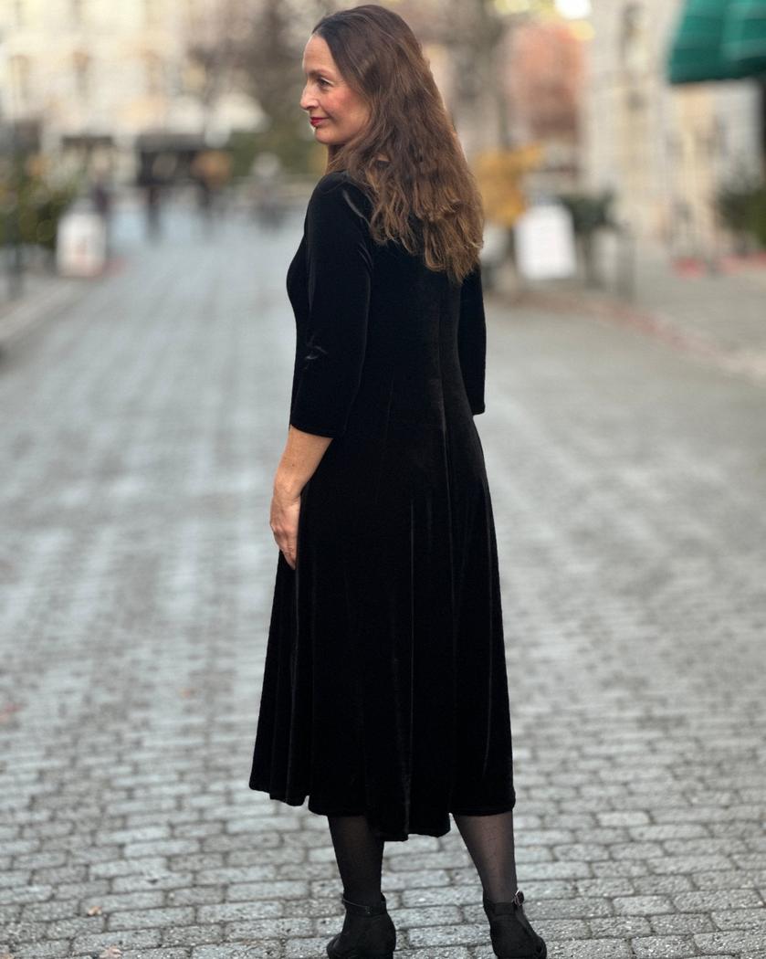 Kjolens midi-lengde og A-fasong gir en silhuett som fungerer til ulike anledninger. Den feminine V-utringningen og de tidløse linjene gjør den lett å style med dine favorittaccessoirer. Trekvart ermer gir fleksibilitet i bruken gjennom flere sesonger.