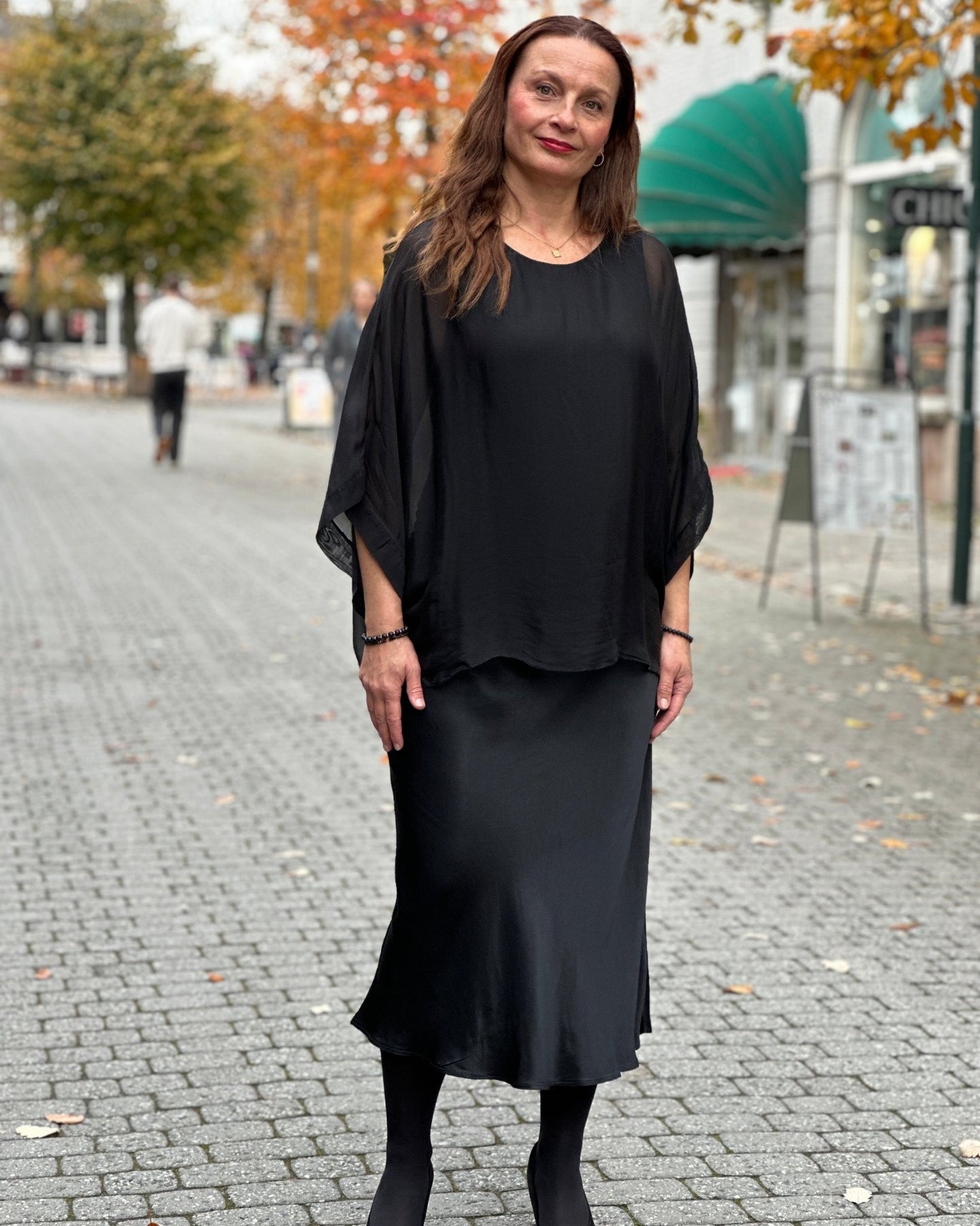 Blusen skiller seg ut med sitt tolagsdesign. Den ytre delen i silke og viskose gir et sofistikert uttrykk, mens den innvendige toppen i stretch-viskose sikrer optimal komfort. Dette gjør blusen til et fleksibelt plagg som passer like godt til hverdags som til mer formelle anledninger. Den lette, oversized passformen gir en avslappet og moderne look, samtidig som den sikrer god bevegelsesfrihet.