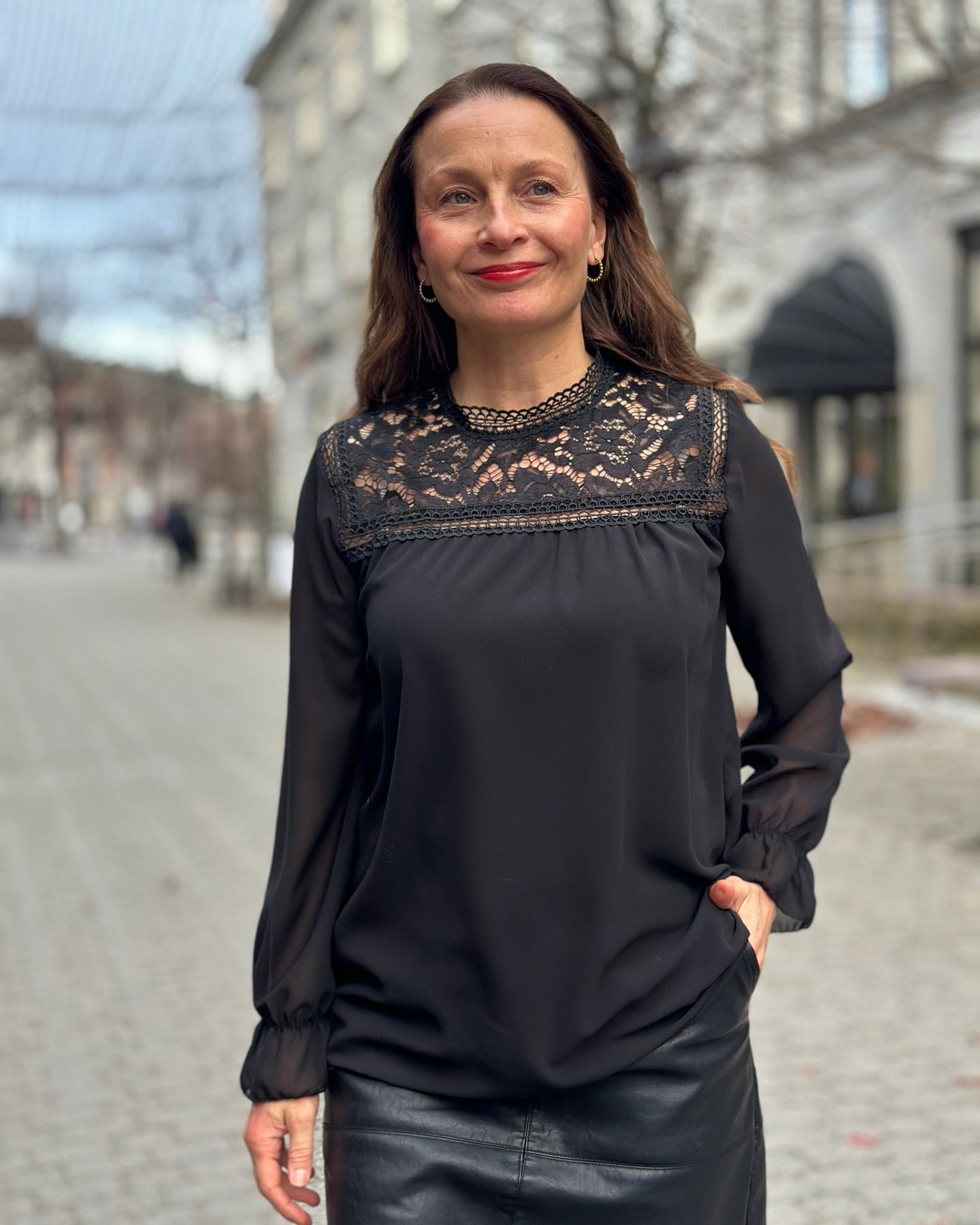 Super fin bluse med nydelig blonde detalj på skulder. Fin liten blonde hals, som har en liten knapp bak.
