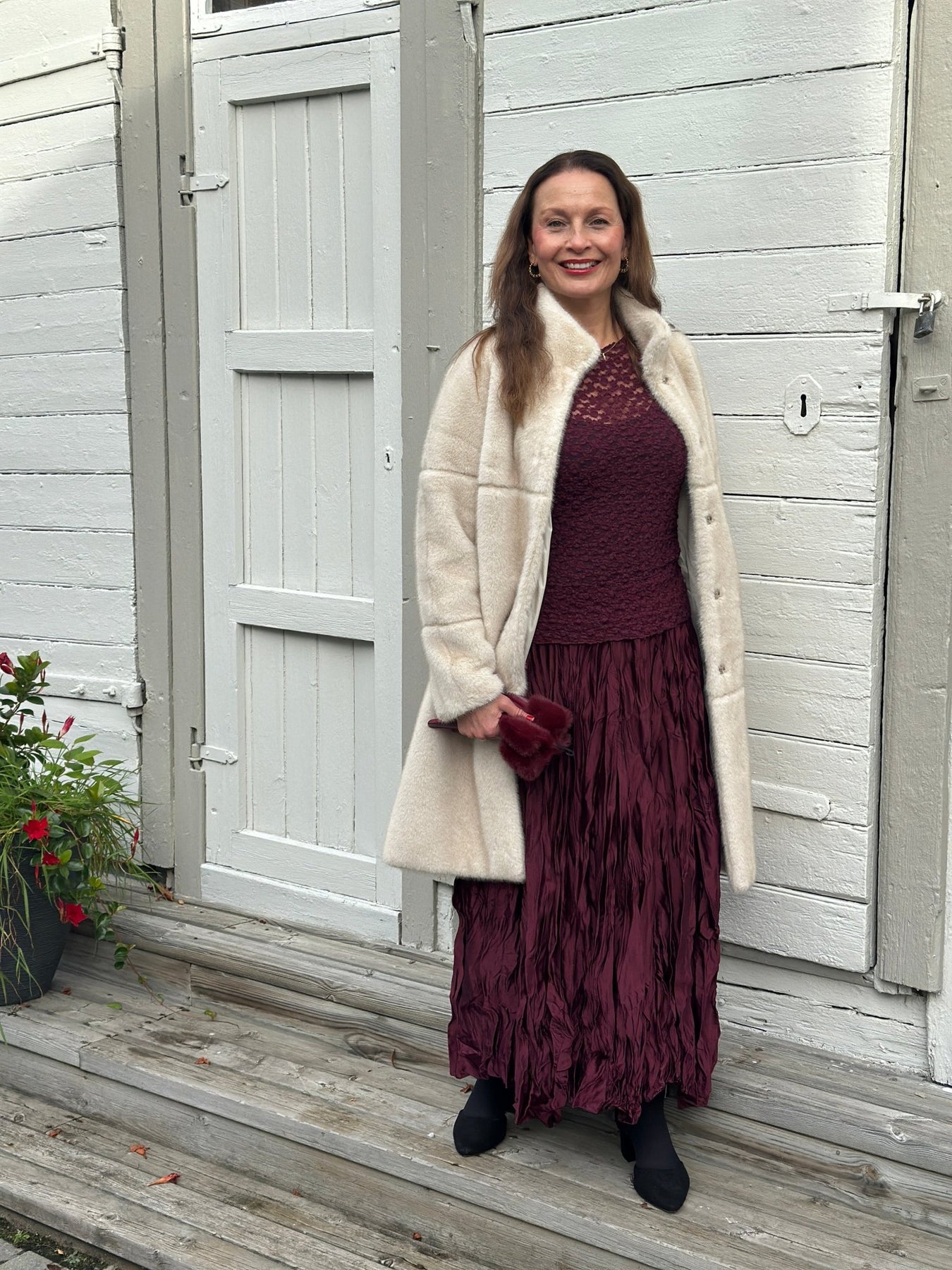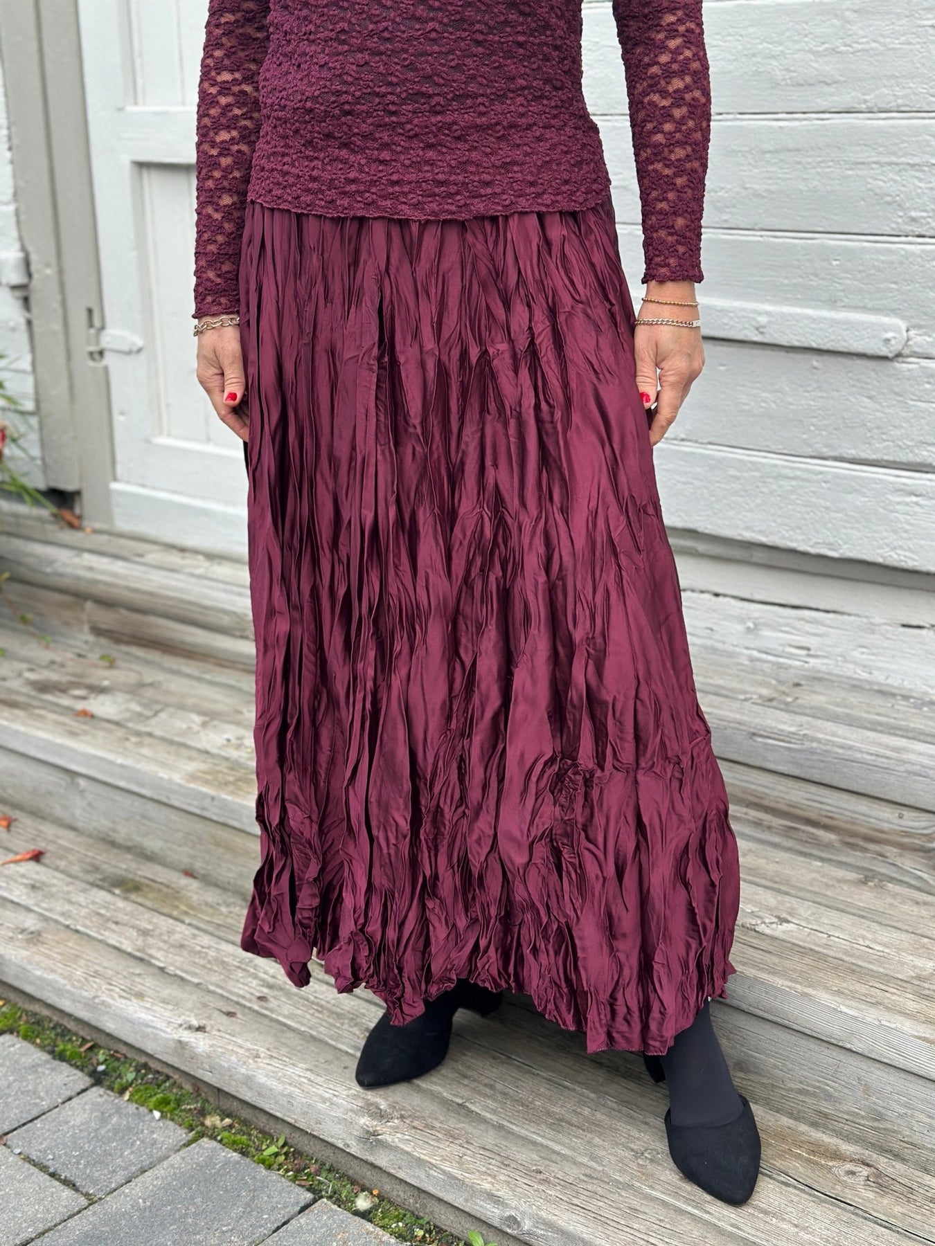 Den krinklede overflaten og den elegante burgunderfargen gjør dette skjørtet enkelt å kombinere med både lyse og mørke overdeler. Perfekt for deg som ønsker et skjørt med særpreg.