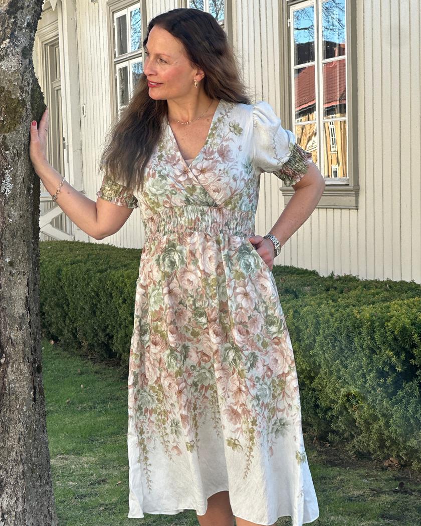 Det lette og pustende materialet gjør kjolen godt egnet for bruk på varme dager. Det elastiske midjebåndet gir en komfortabel passform som tilpasser seg kroppen uten å stramme.