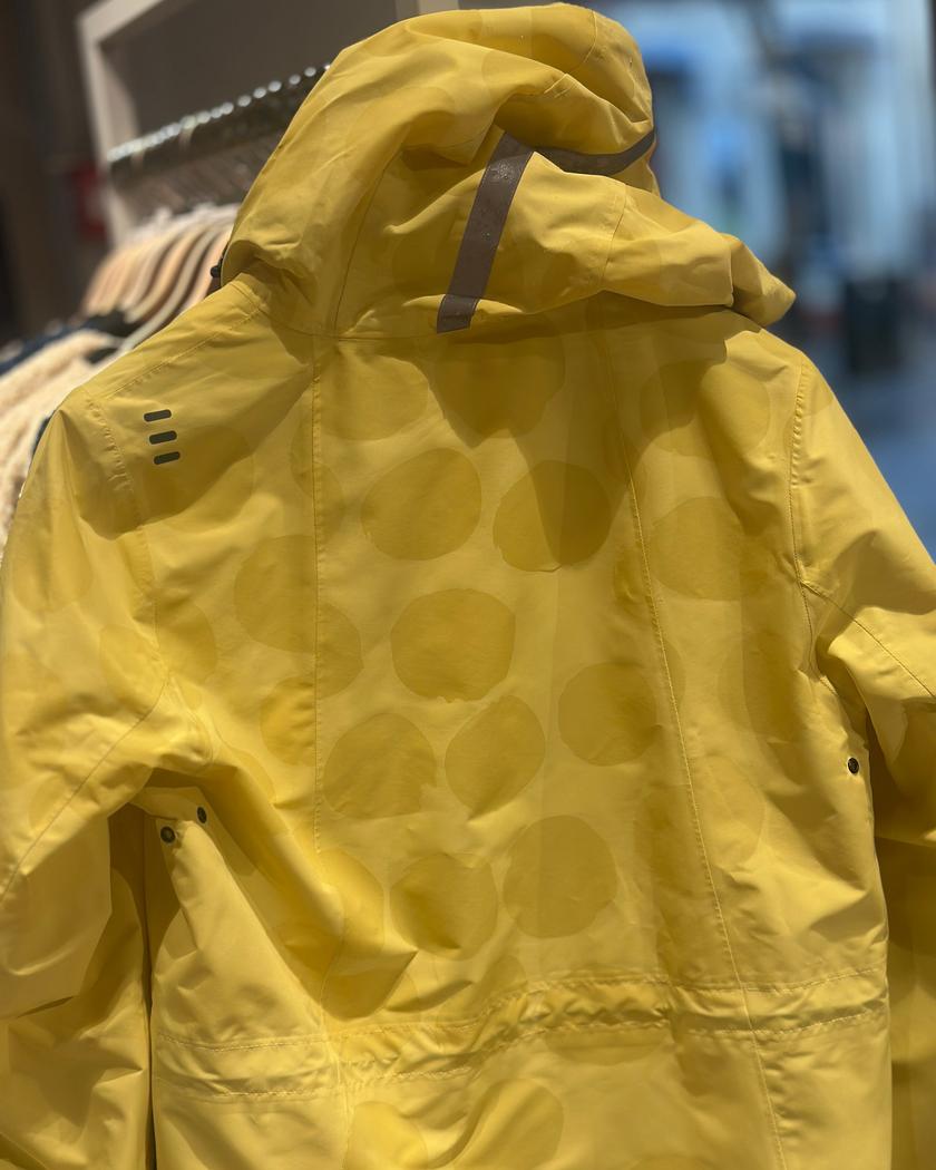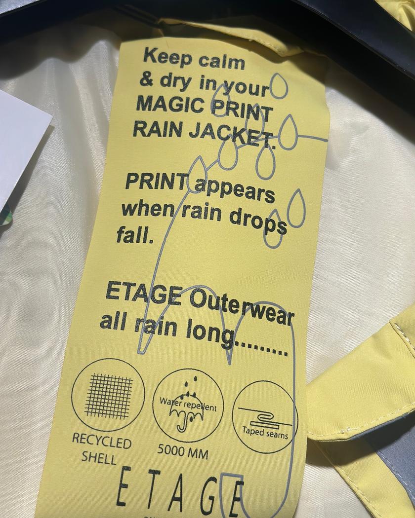 Møt Regnjakke m/hette fra Etage, en praktisk jakke som kombinerer funksjonalitet med en uventet detalj. Denne regnjakken har et unikt magic print som vises når stoffet blir vått, noe som gir jakken et spennende særpreg i regnværet.