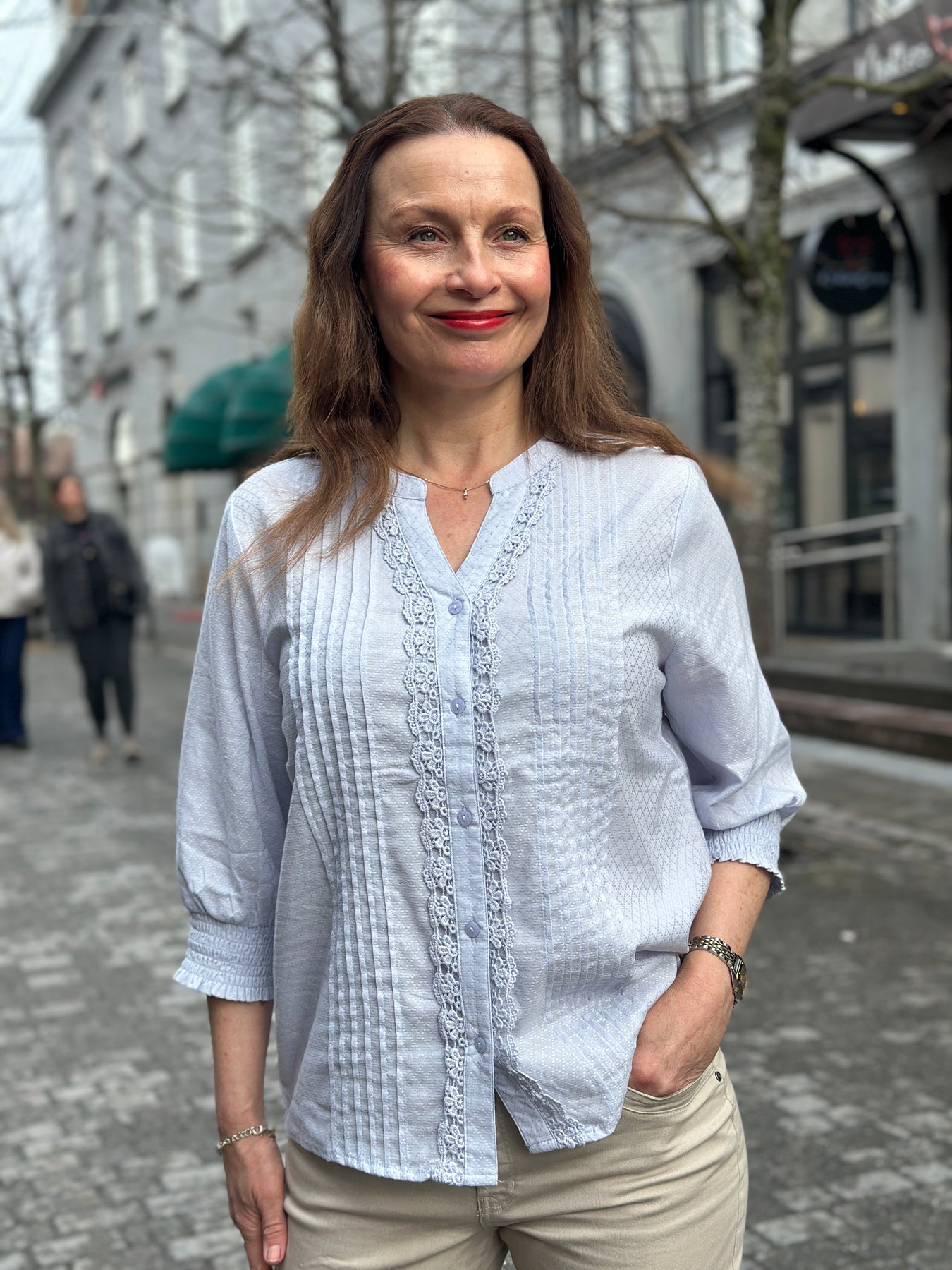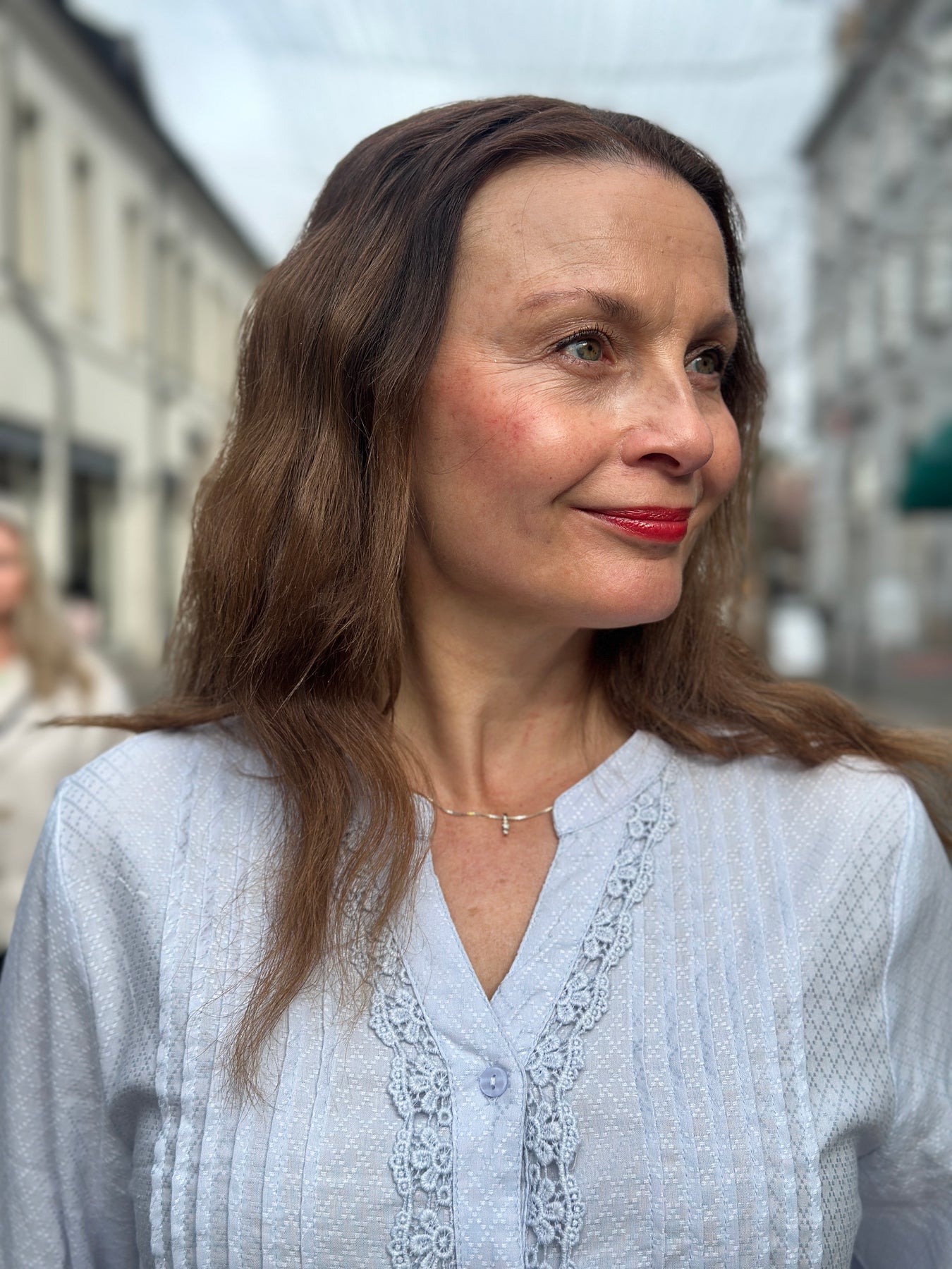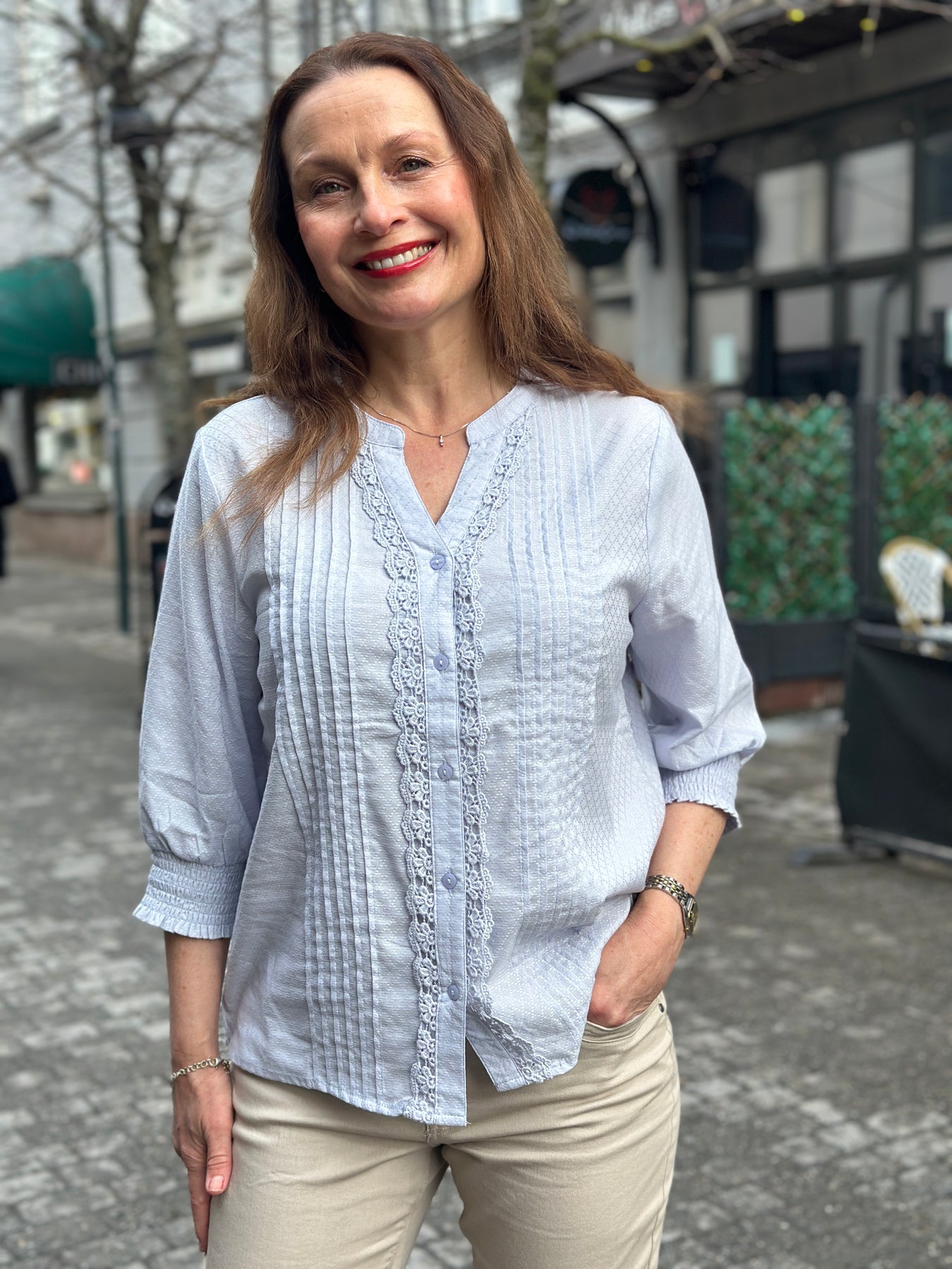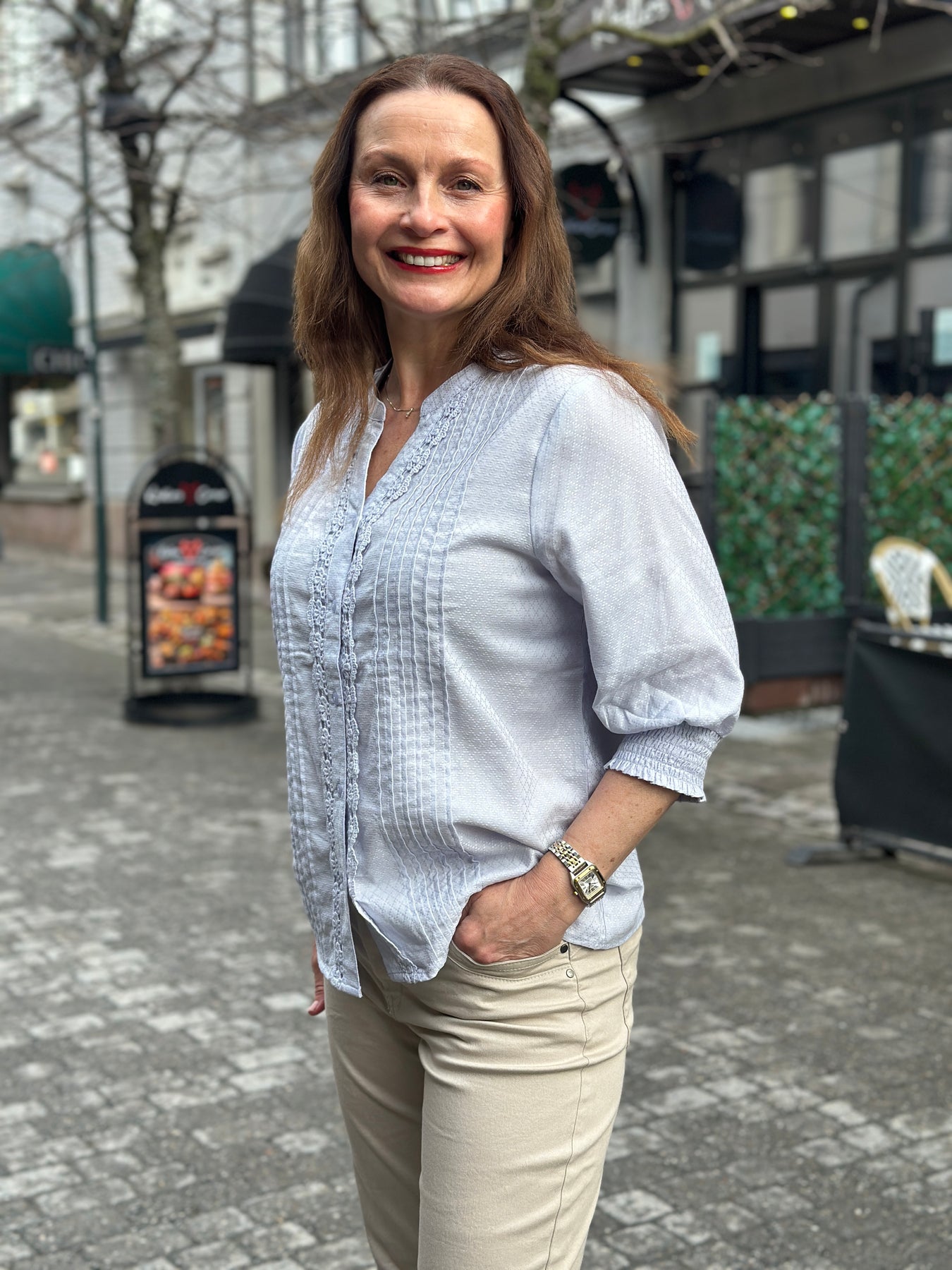 Kvinne i lys bluse med 3/4-ermer, blonder og strukturert mønster, smilende utendørs.