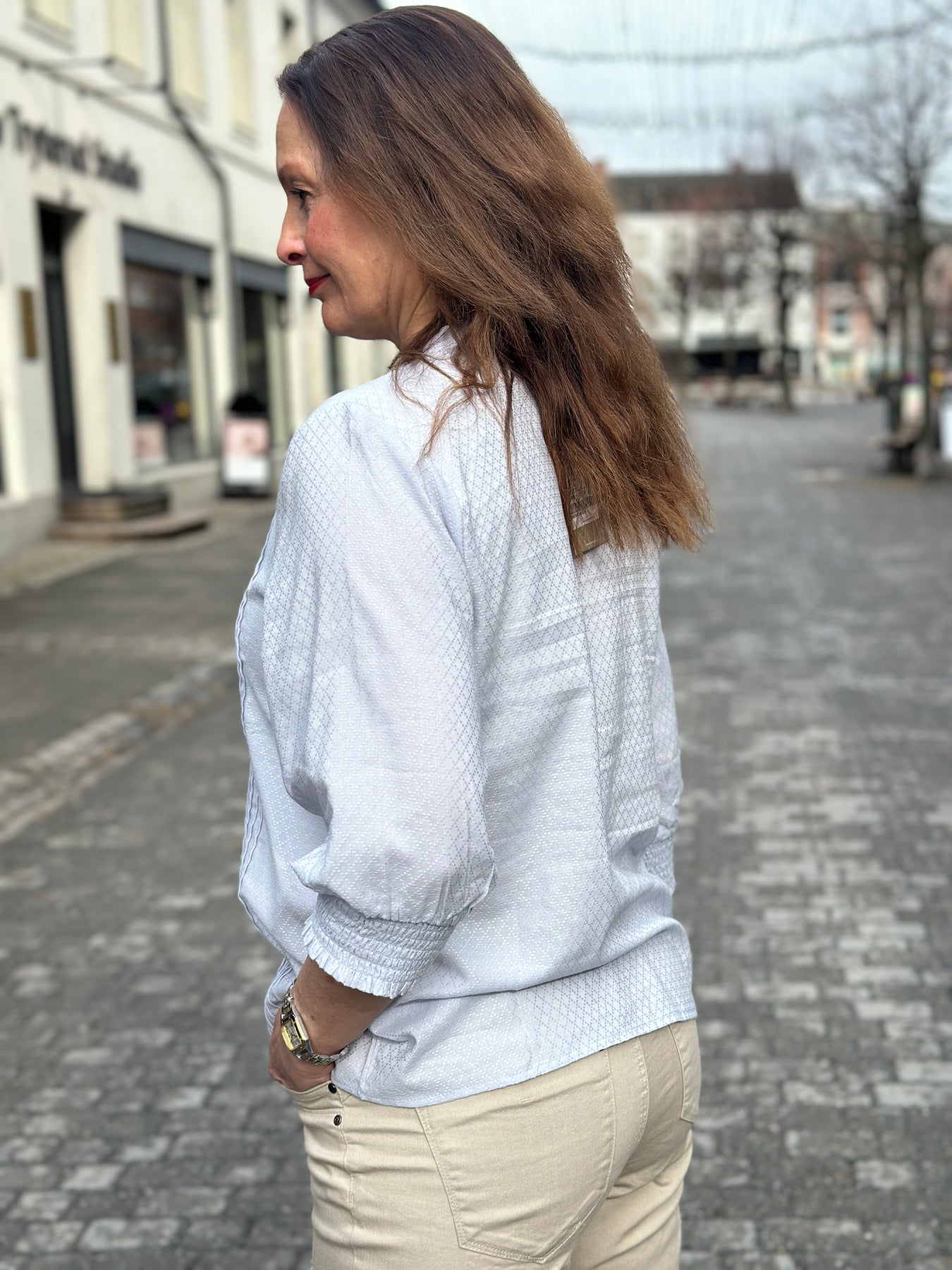 Kvinne med lys bluse med 3/4 ermer og beige bukser. Blusen har strukturert mønster og detaljer.
