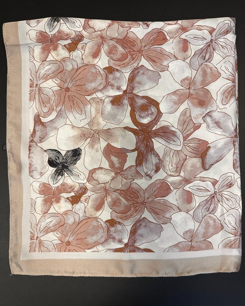 Dette skjerfet har en silkeaktig følelse mot huden, laget av 100 % polyester. Det måler 70 x 70 cm, en praktisk størrelse som gir deg flere måter å style det på. Mønsteret viser blomster og sommerfugler i myke rosa, beige og svarte toner.