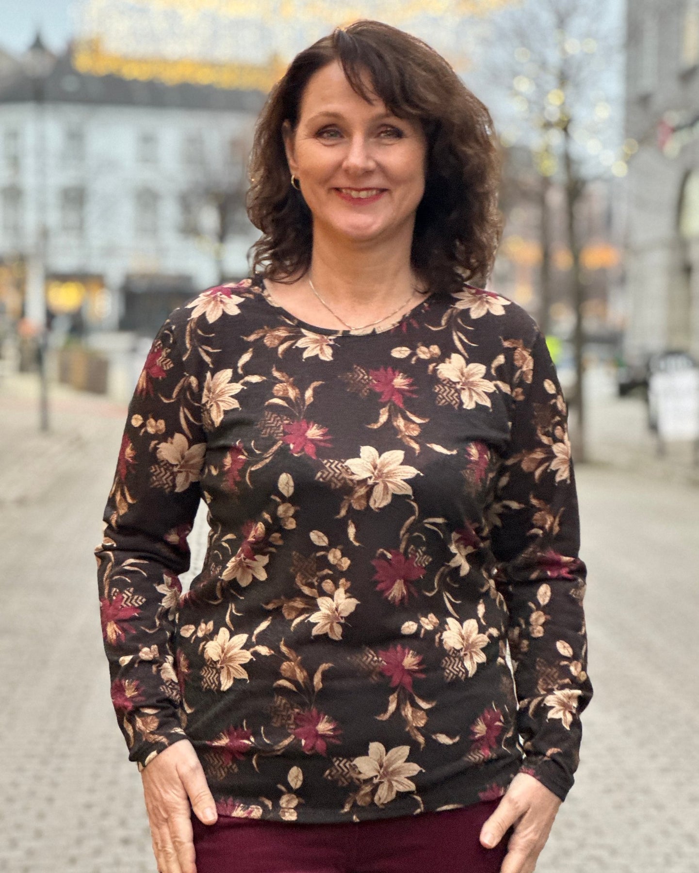 Ellen presenterer Topp Print on lurex, en langermet topp som kombinerer stil og komfort. Denne toppen har et slående blomsterprint på mørk bakgrunn, med krem- og kastanjefargede blomster som skaper en vakker kontrast. Den normale passformen og den elastiske stoffblandingen sikrer en behagelig følelse hele dagen.