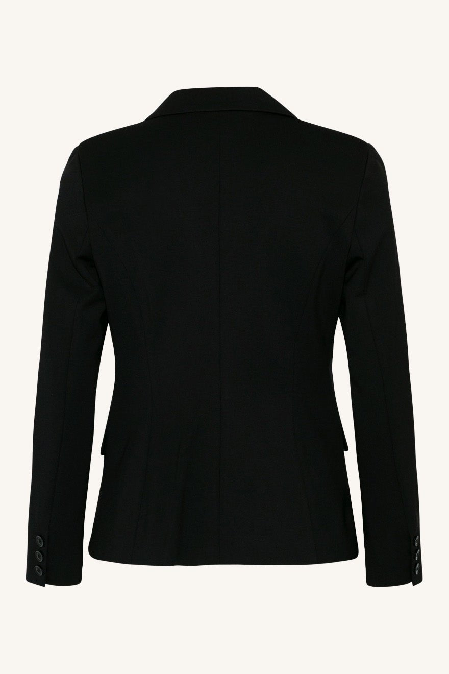 Klassisk svart blazer med to knapper, klafflommer og tre knapper på hver mansjett.