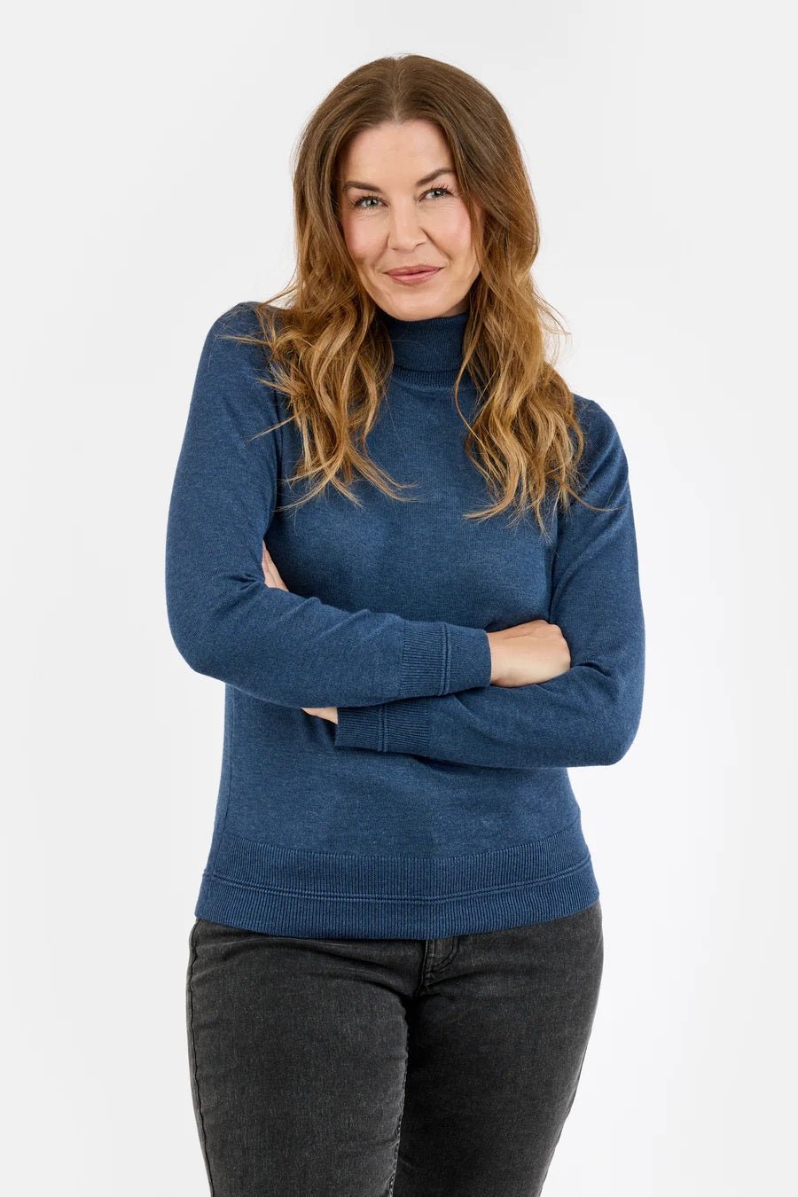 Blå genser med høy hals, ribbestrikket kant nederst og lange ermer, båret av en kvinne.
