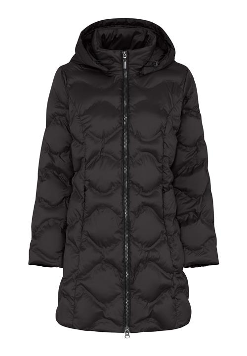 Lang, svart dunjakke med quiltet mønster, hette og glidelås foran.