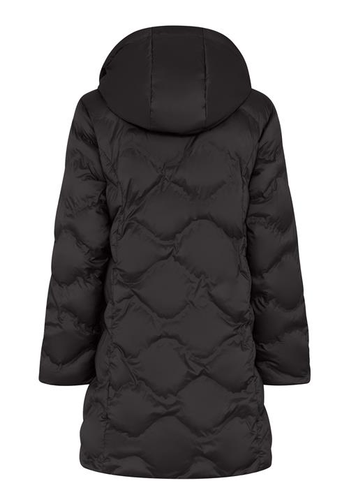 Lang svart jakke med hette og quiltet mønster på baksiden.