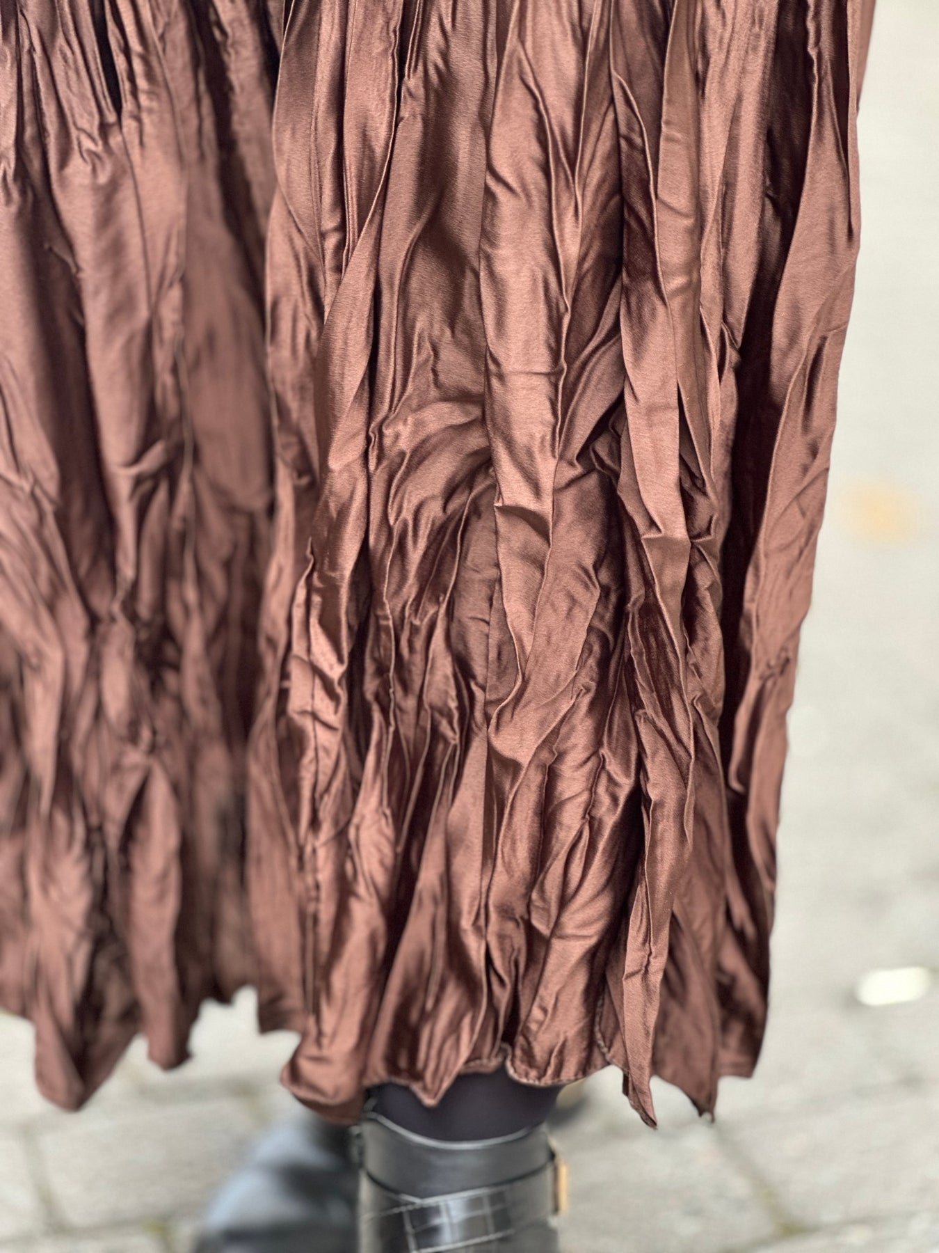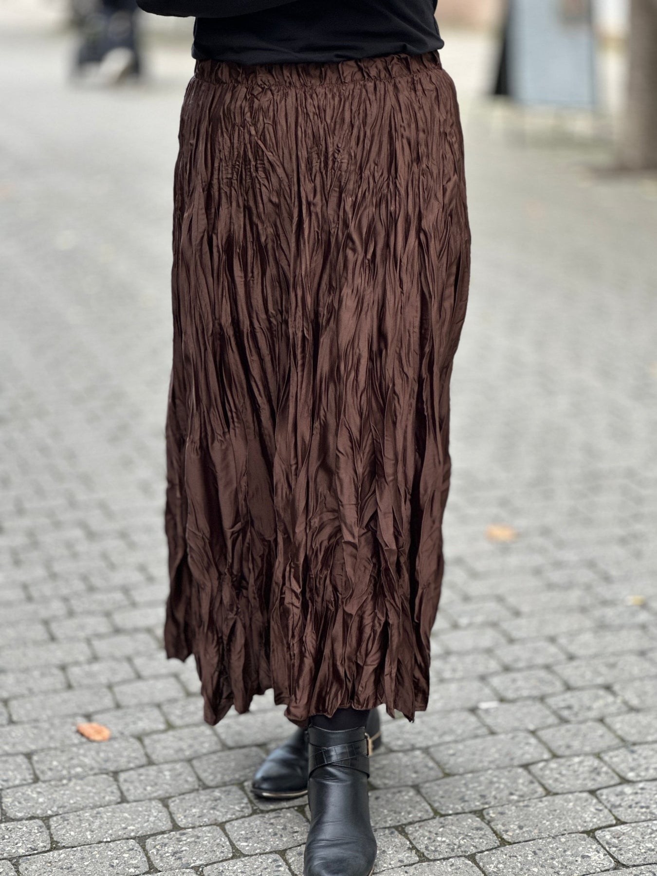 Den brune fargen og den krinklede overflaten skaper et interessant spill i stoffet. Skjørtet passer fint til både hverdags og fest, og kan styles med både gensere og bluser.