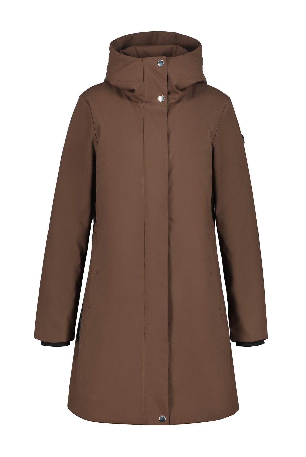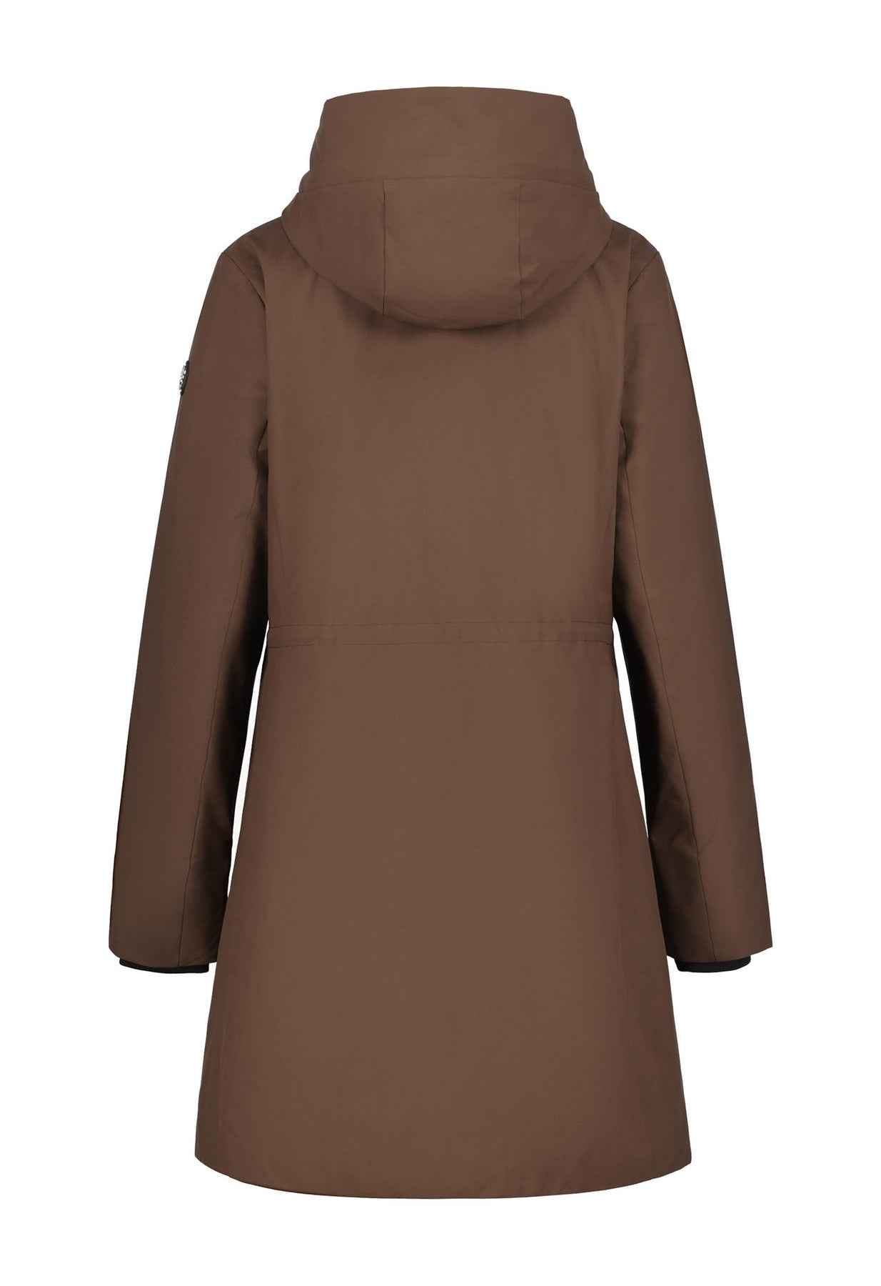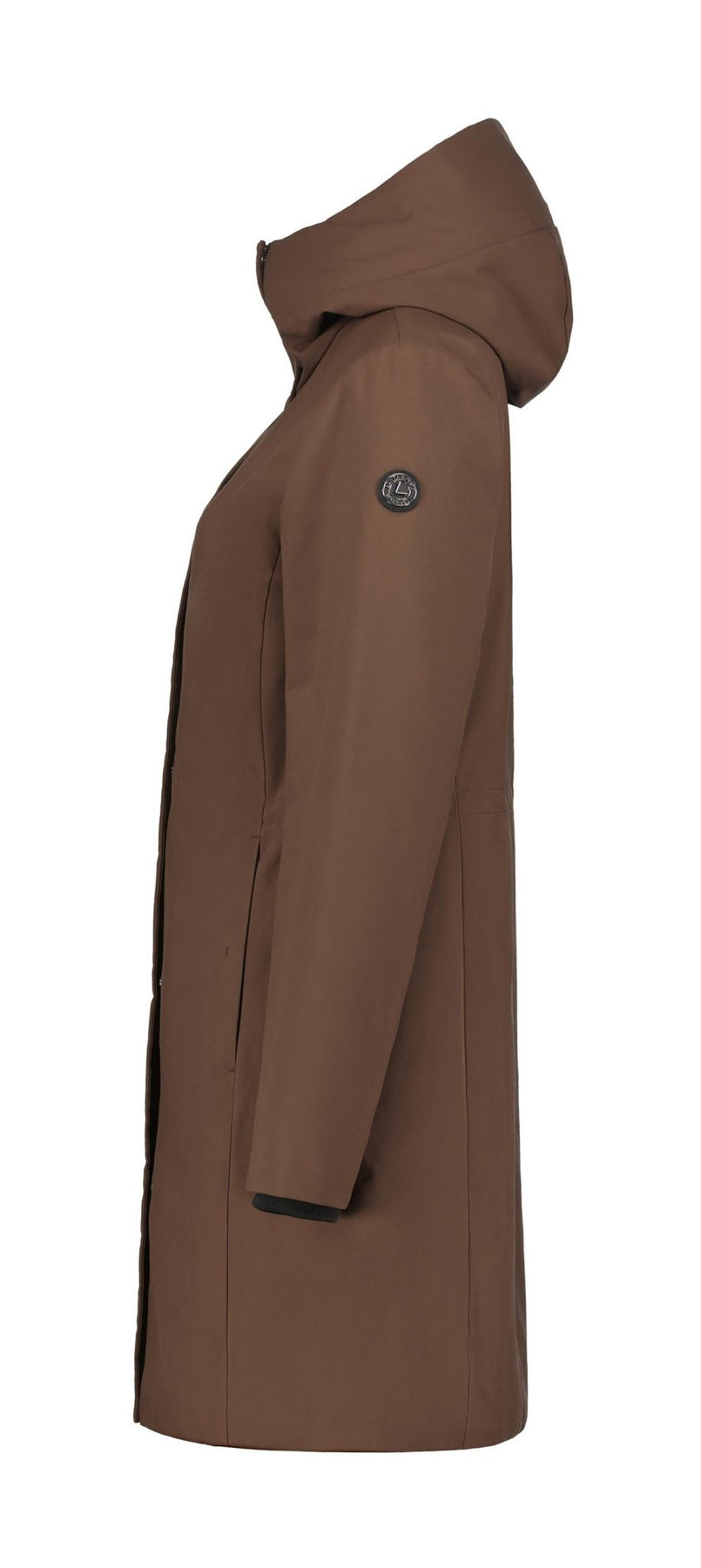 Brun jakke med hette, sett fra siden. Logo på venstre arm, knapper foran. Enkel stil.