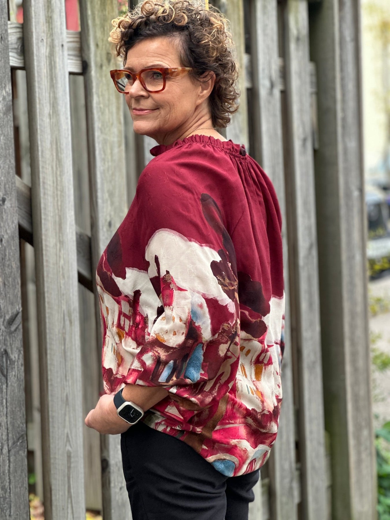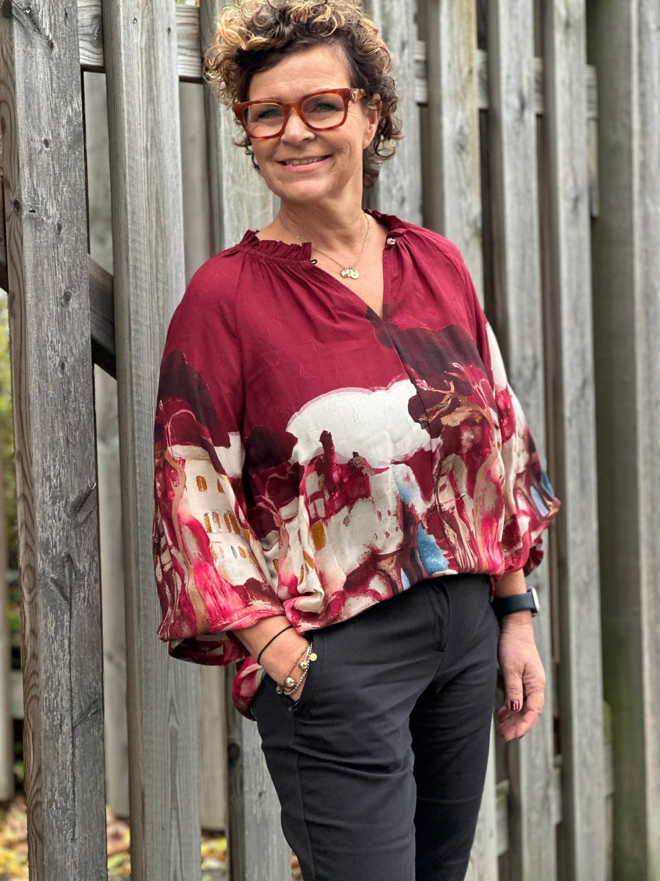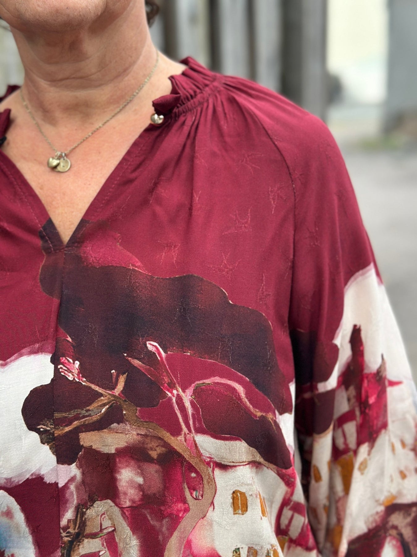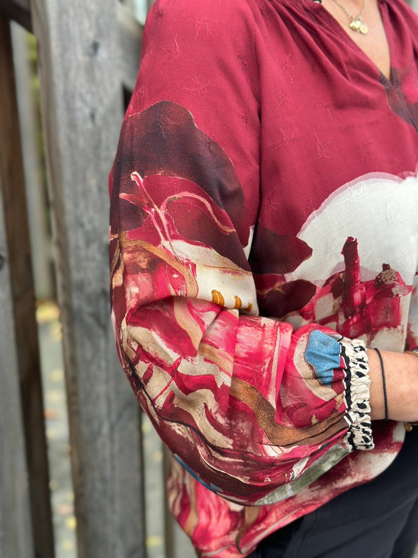 Fra Imprezz kommer denne viskoseblusen med et kunstnerisk mønster i rødt, hvitt og blått. Den myke viskosekvaliteten gir en behagelig følelse mot huden, mens raglanermene sikrer god bevegelsesfrihet.