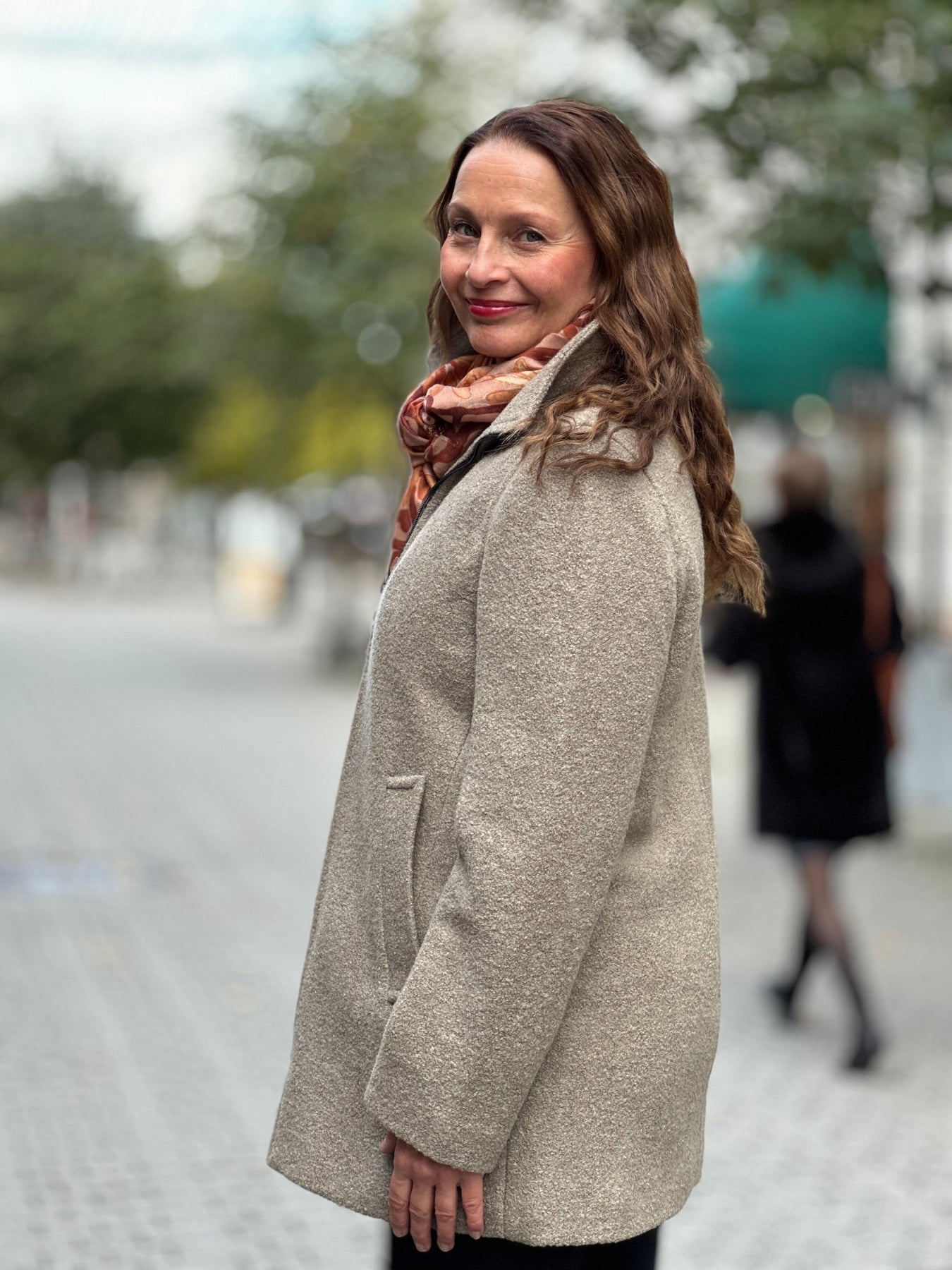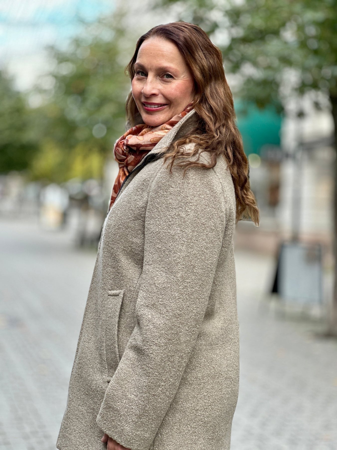 Kvinne i beige ulljakke med høy krage og lommer, står ute med skjerf og trær i bakgrunnen.