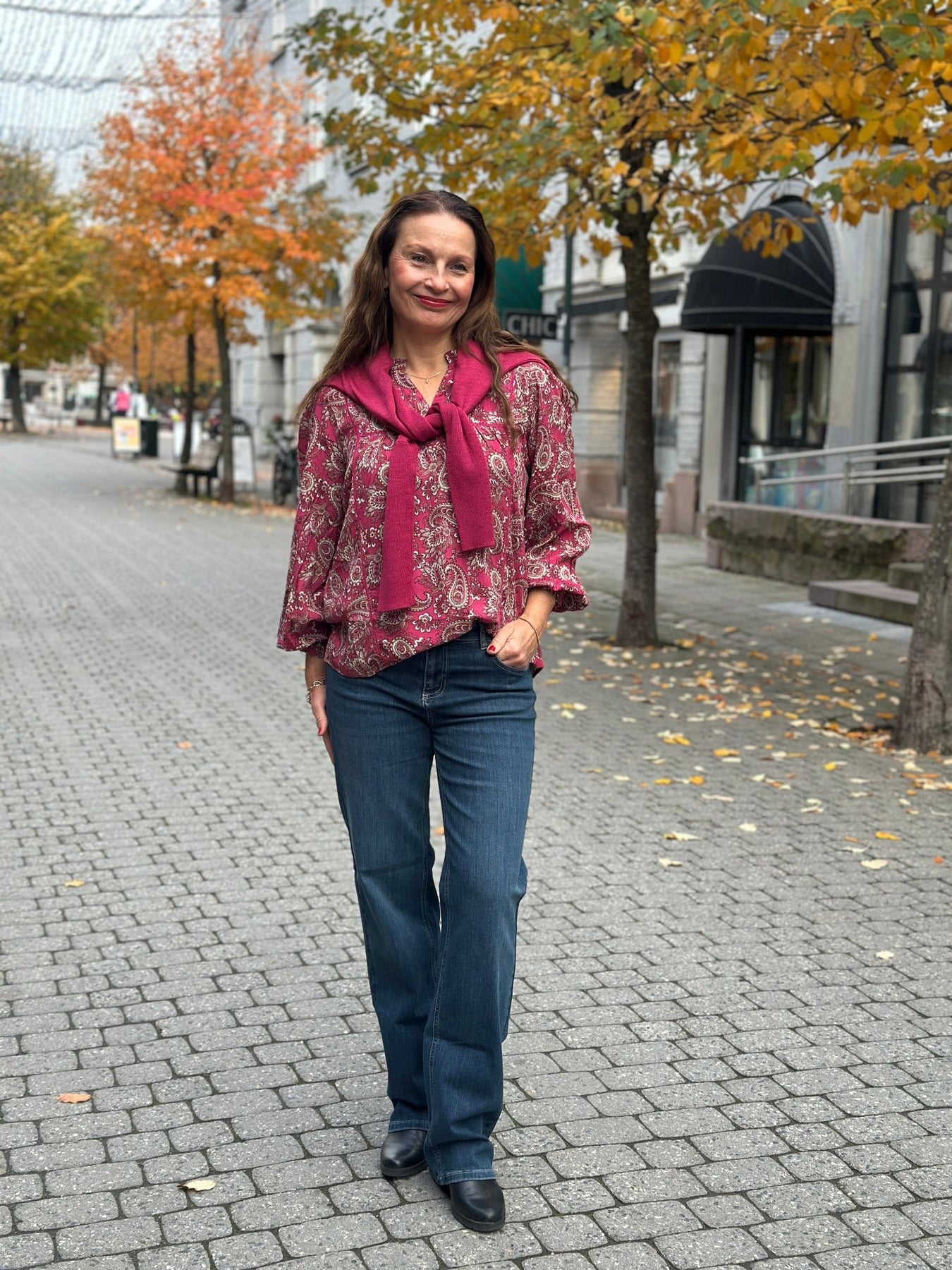 De elastiske ermene gir blusen et moderne preg og god bevegelsesfrihet. Paisleymønsteret og fargevalget skaper et feminint uttrykk som kler mange forskjellige antrekk.