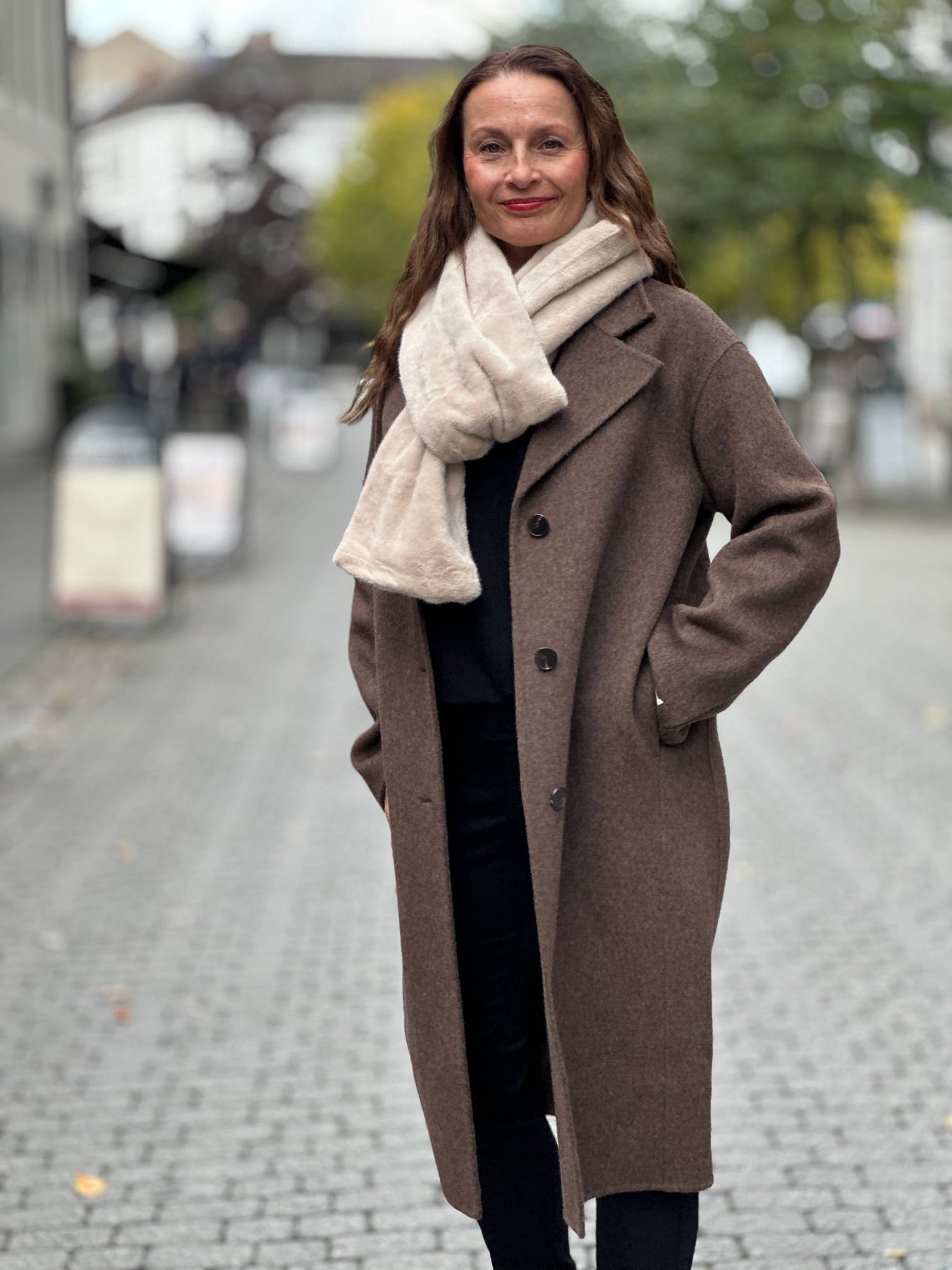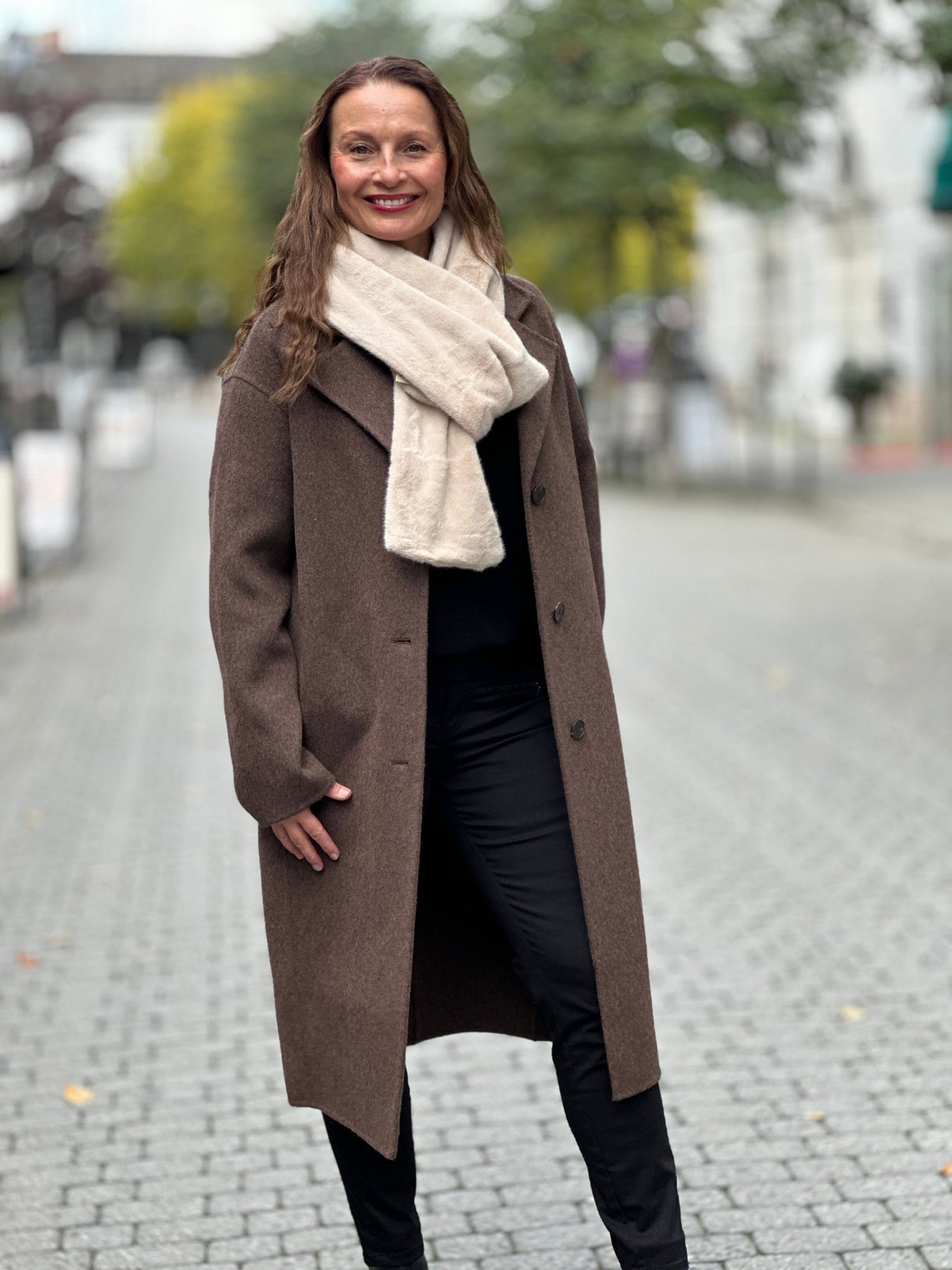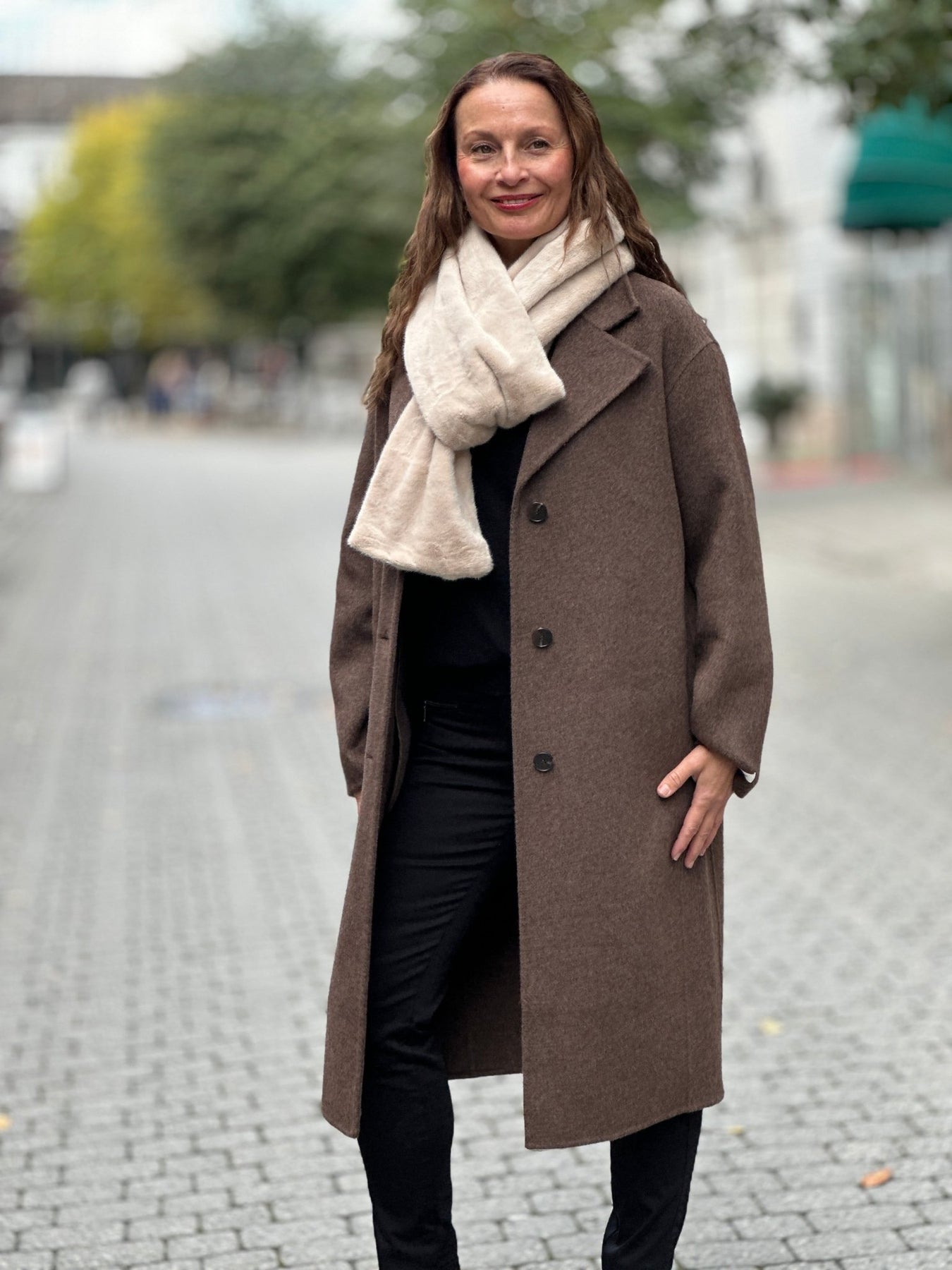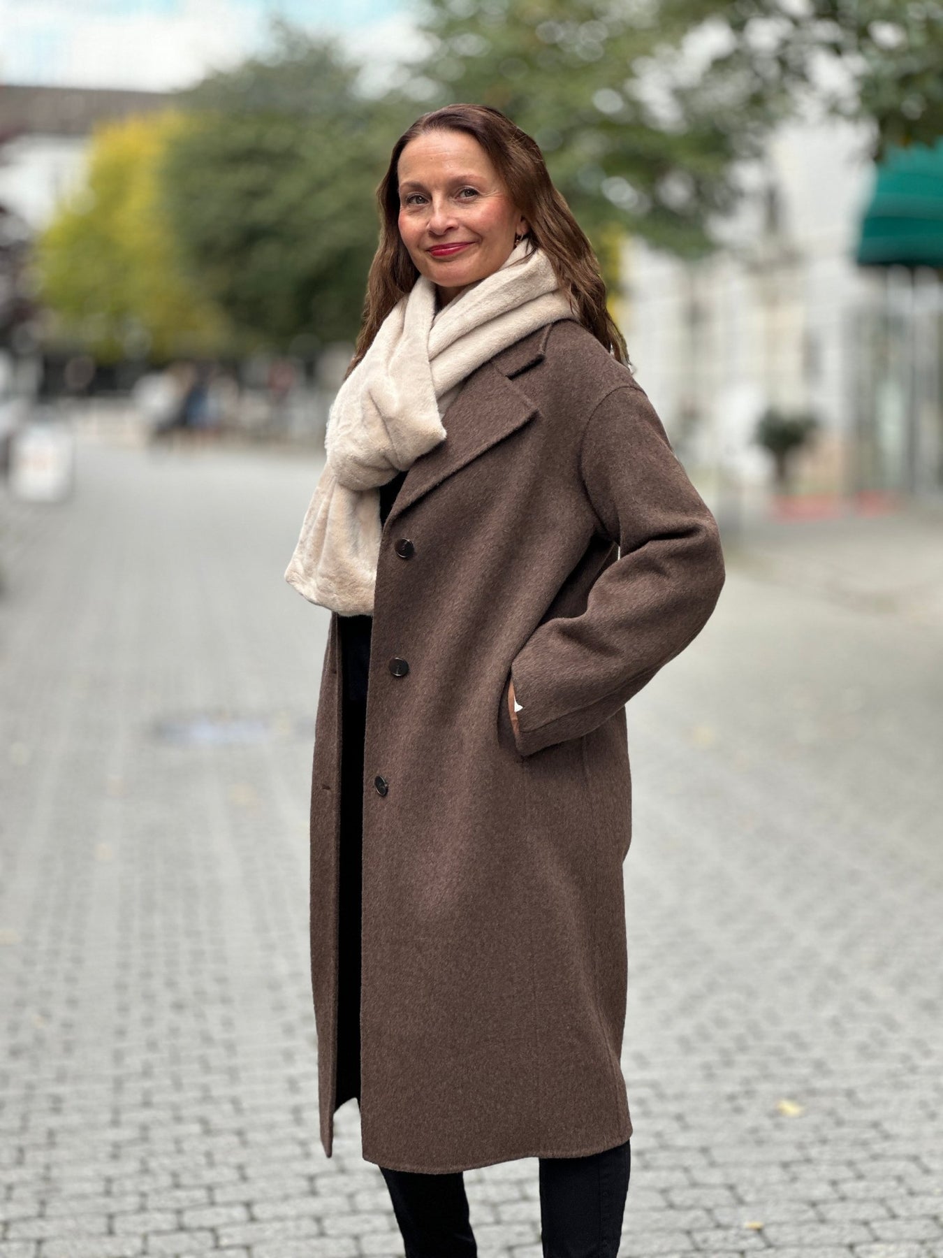 Ullens naturlige egenskaper holder deg varm selv på kalde dager. Den klassiske brune fargen og det rene designet gjør kåpen enkel å style med resten av garderoben.