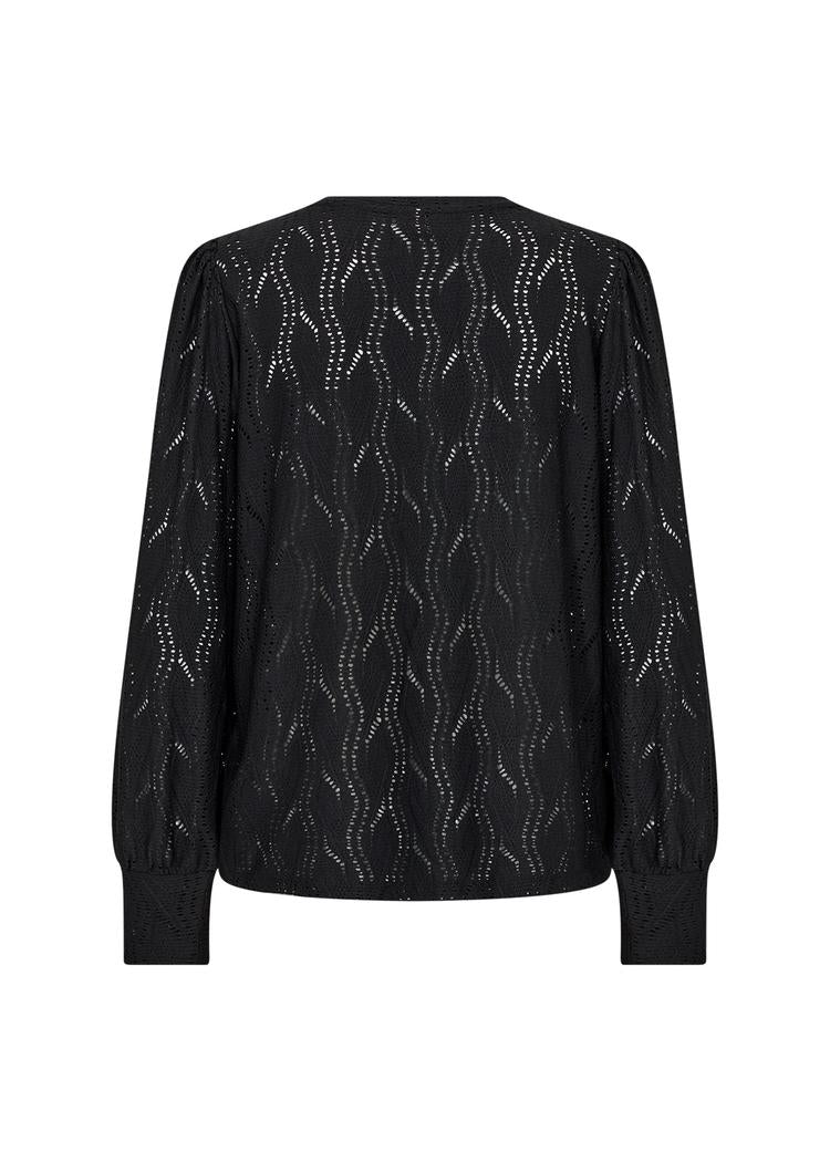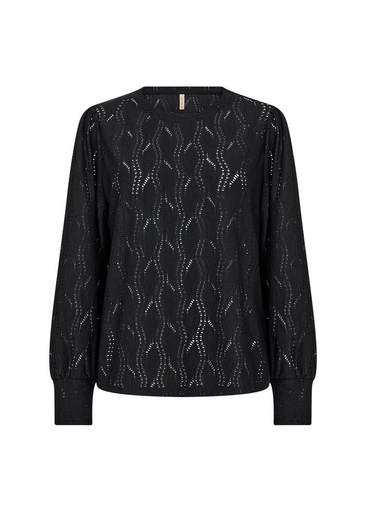 Nyt komforten med denne Soyaconcept-blusen i svart. Det karakteristiske bølgemønsteret med hullstruktur gir et subtilt og interessant uttrykk, mens den runde halsen og de lange ermene skaper en fin balanse.