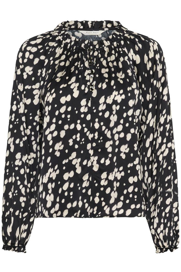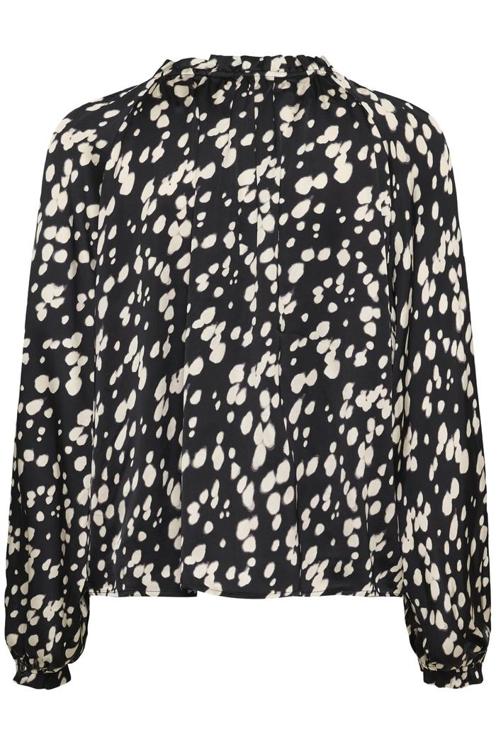 Svart bluse med hvitt mønster, rynket krage, knapper foran og lange ermer med elastiske mansjetter.