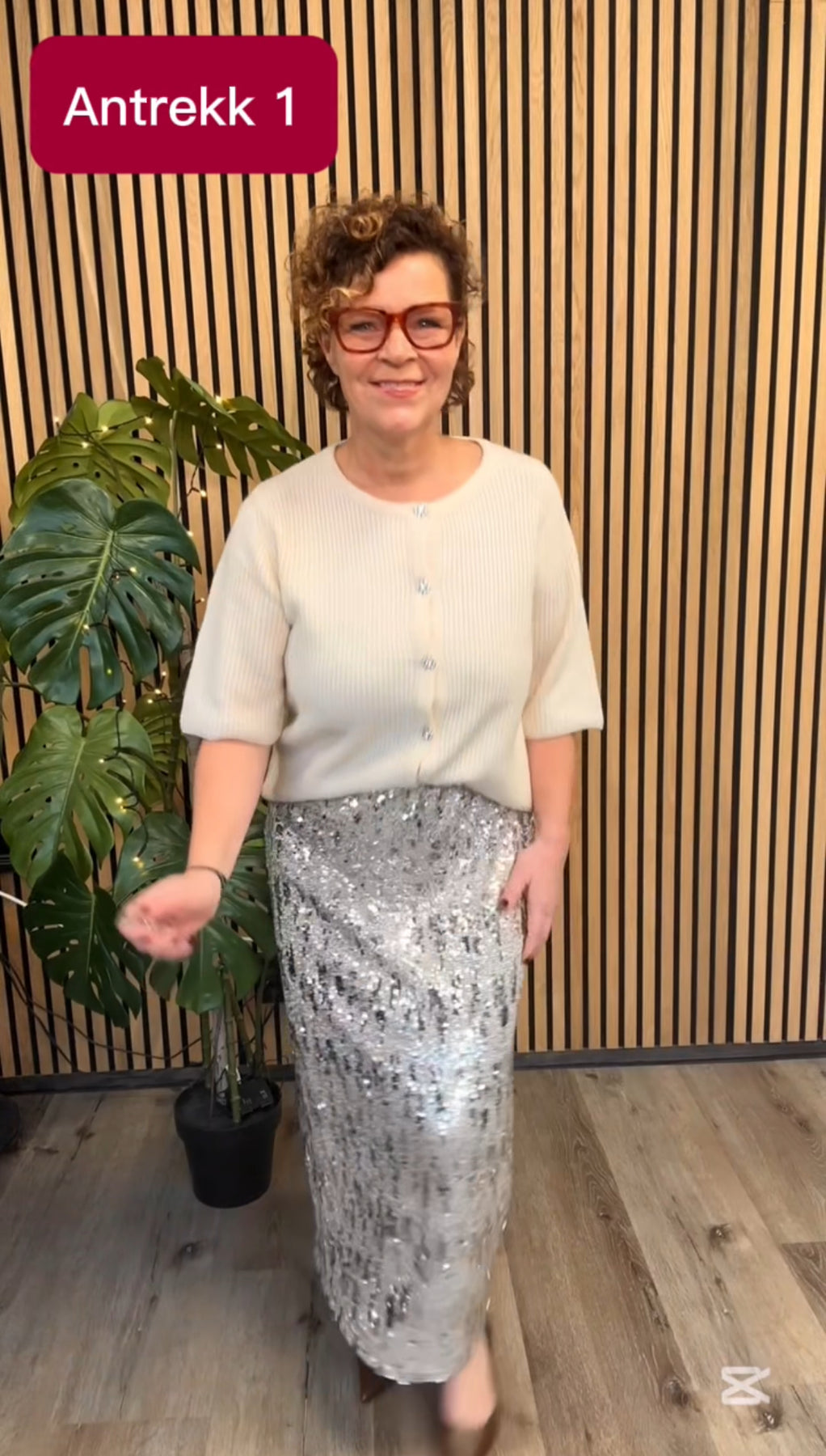 Kvinne i kremfarget cardigan med trekvart ermer og mørkt skjørt.