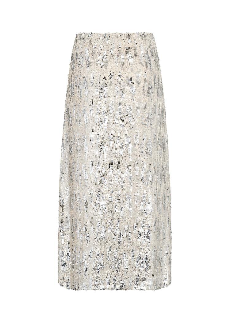 De glitrende paljettene gir skjørtet et festlig preg, mens den klassiske lengden og snittet holder det sofistikert. Materialblandingen sikrer at skjørtet holder seg fint gjennom kvelden.