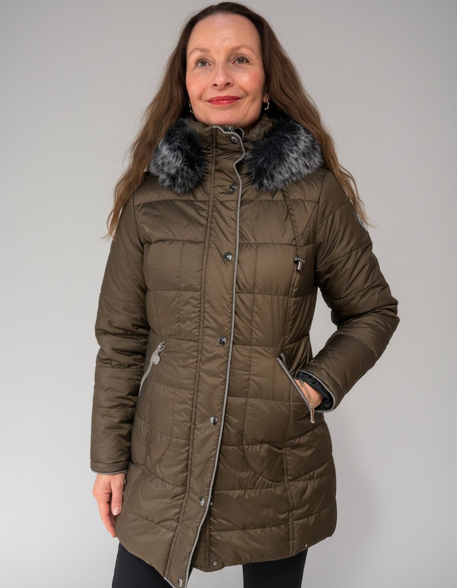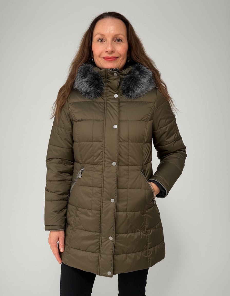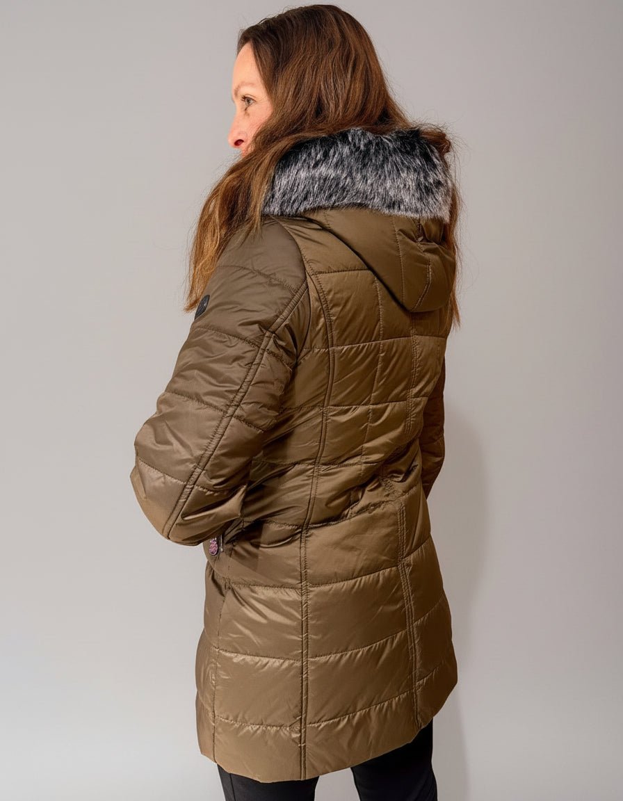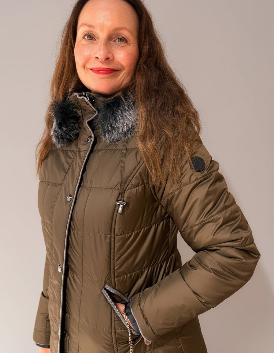 Jakke med fuskepels fra Normann Coat kombinerer beskyttelse og stil. Denne vannavvisende og fluorfrie jakken gir trygghet mot vær og vind uten bruk av skadelige kjemikalier. Det quiltede designet sikrer god isolasjon, mens den avtagbare hetten med fuskepels lar deg variere utseendet.