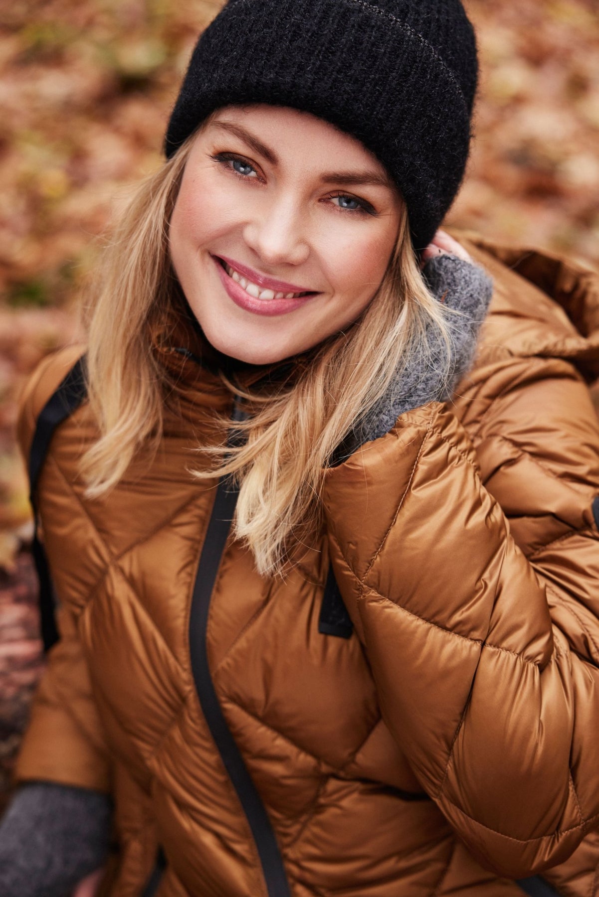 Kvinne i brun, quiltet dunkåpe med glidelås og svart lue, smilende i høstomgivelser.