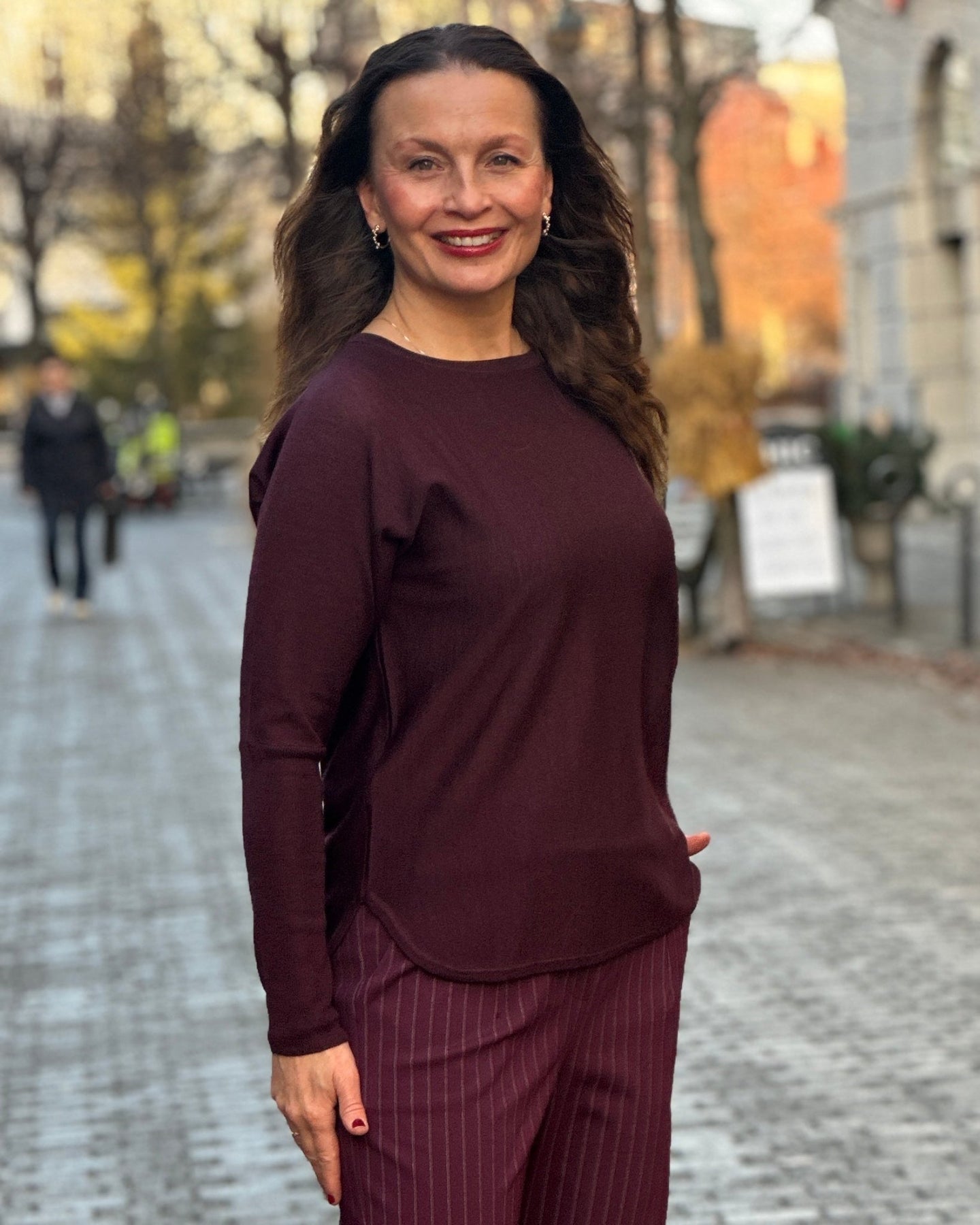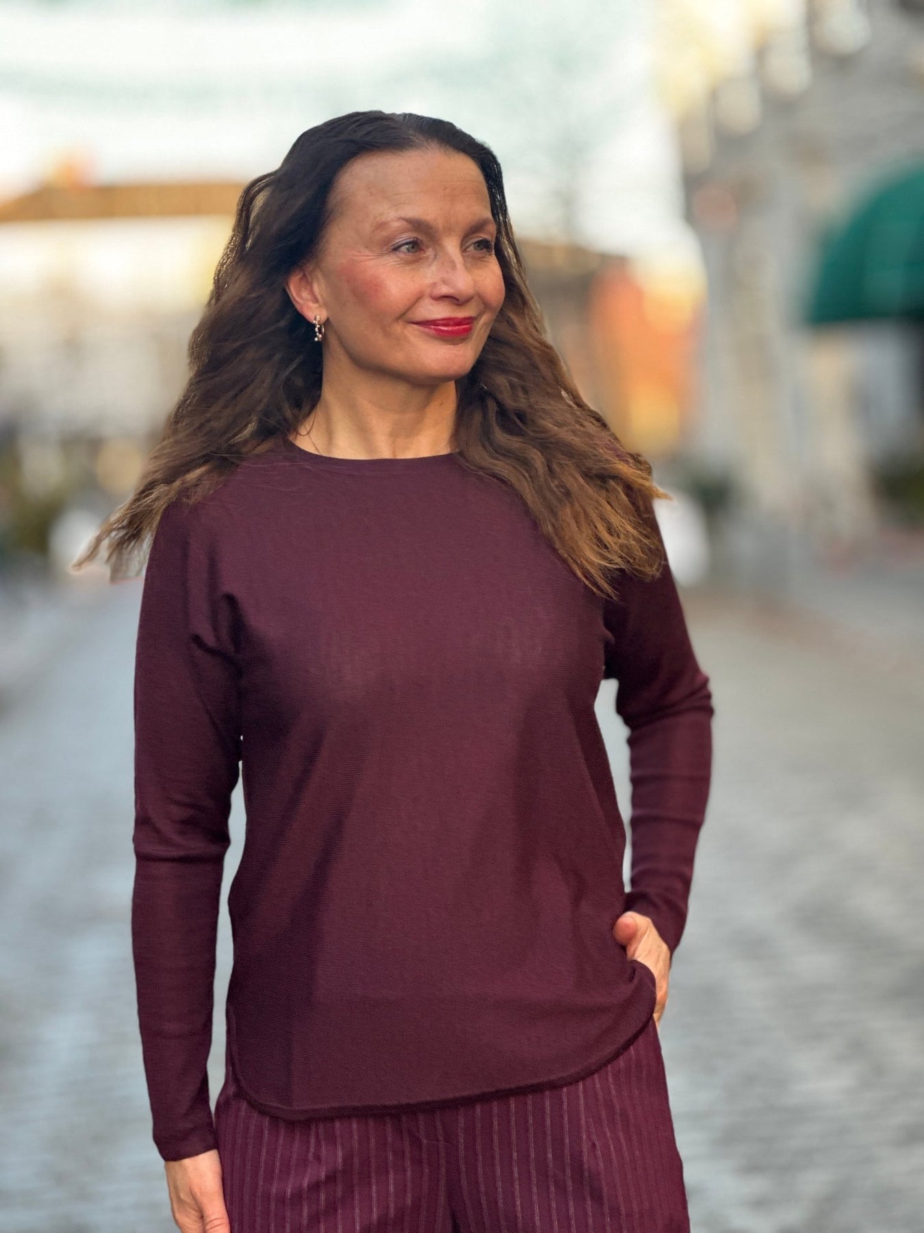 Burgunderrød pullover i 100% merino med rund hals og lange ermer. Enkel og elegant design.