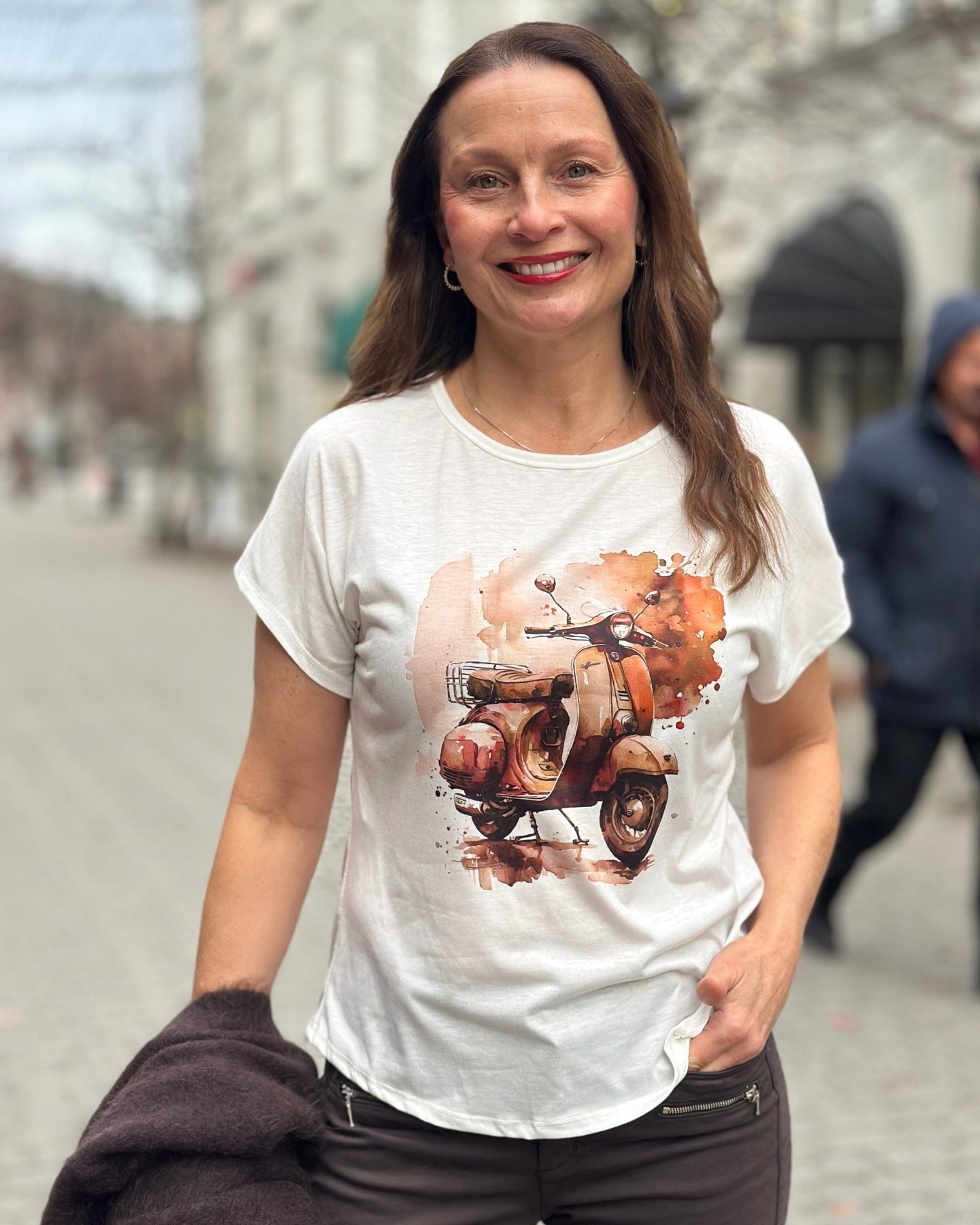 T-skjorte med kort erme og kunstnerisk scootertrykk i varme farger. Mulig detalj på baksiden.