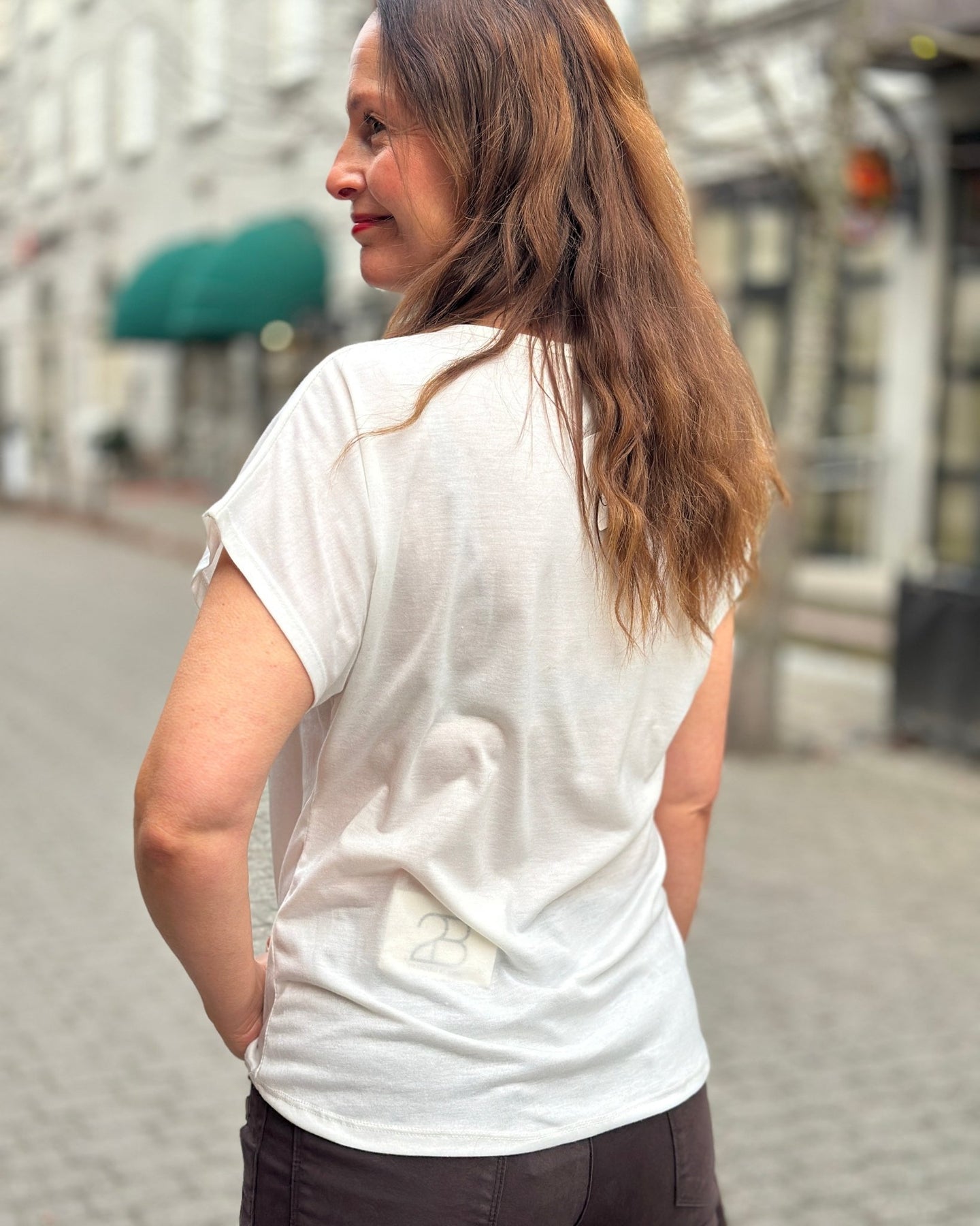 Kvinne i hvit T-skjorte med kort erme, liten detalj på nedre rygg, uskarp bygate i bakgrunnen.