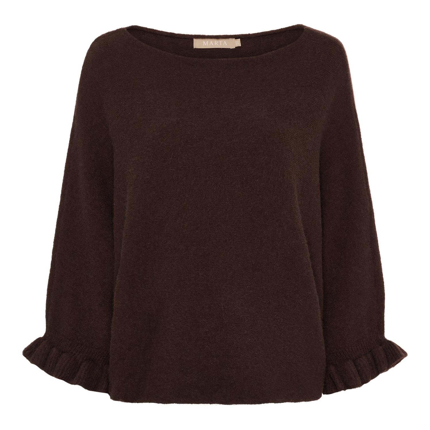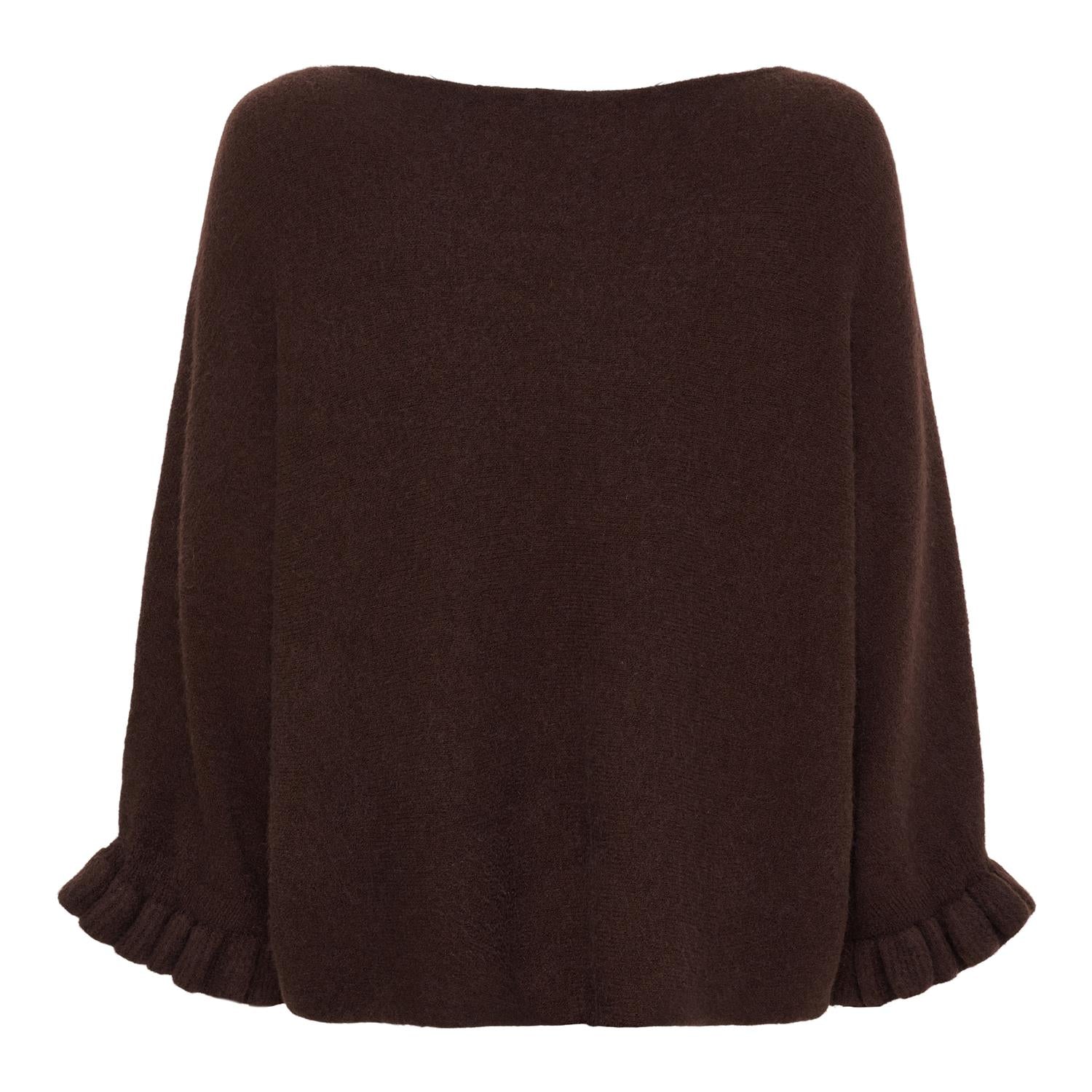 Mørk brun strikkegenser med rund hals, vide ermer og ribbestrikkede kanter. Størrelse "ONE SIZE".