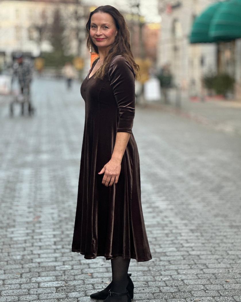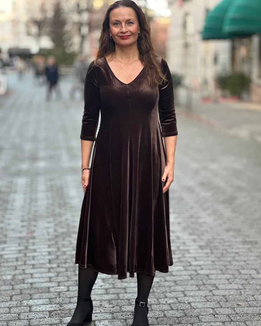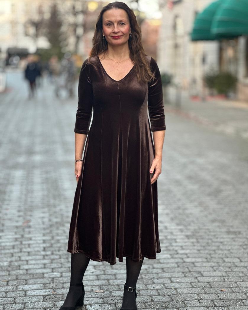 Denne velourkjolen fra Found By Stili har en A-formet fasong som gir en balansert silhuett. V-utringningen skaper et klassisk feminint uttrykk, mens den myke velouren gir kjolen et behagelig preg. Designet kombinerer en tradisjonell form med et materiale som fungerer godt til forskjellige anledninger.