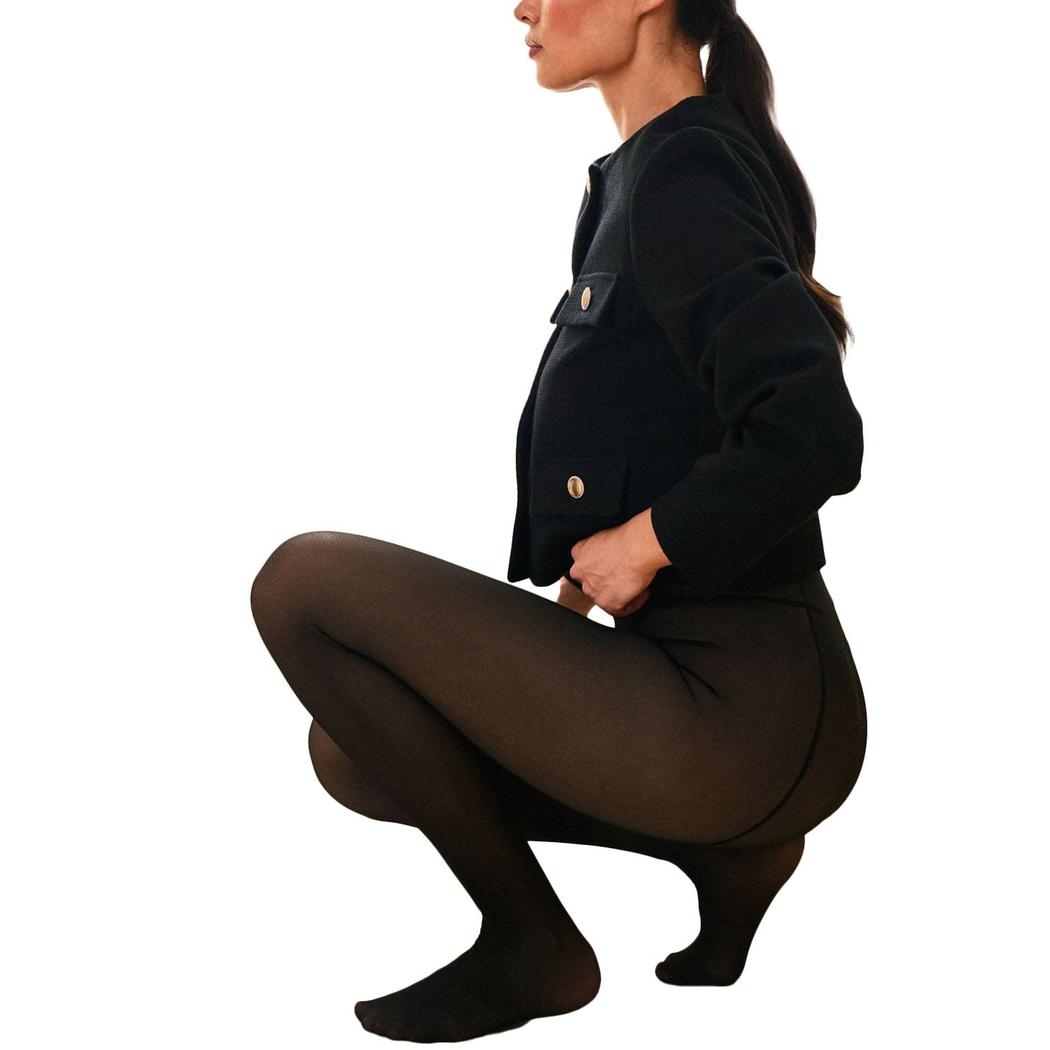 En person i sorte strømpebukser og jakke med knapper, sitter på huk. Strømpebuksene dekker hele benet.