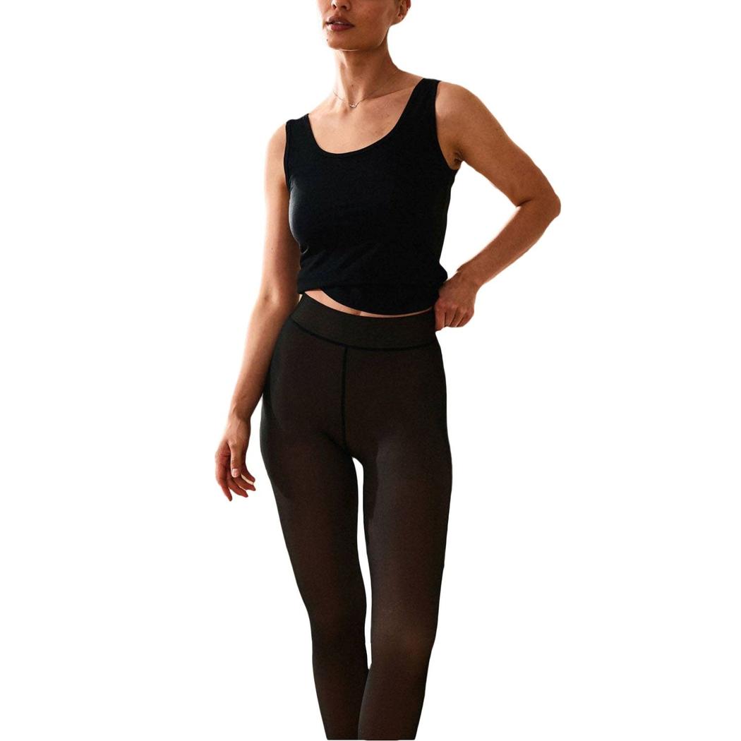 Sorte strømpebukser med elastisk linning, kombinert med en sort ermeløs topp.