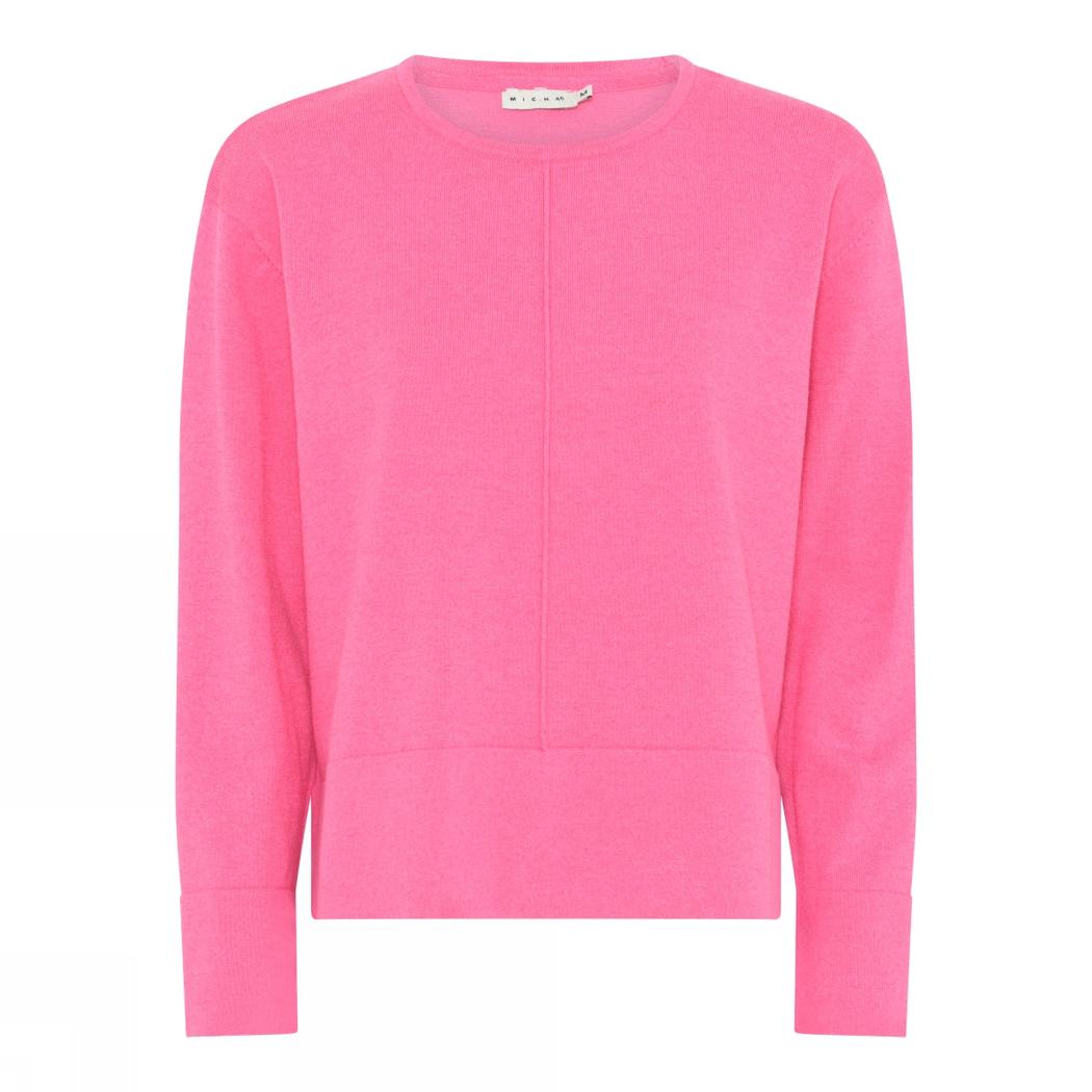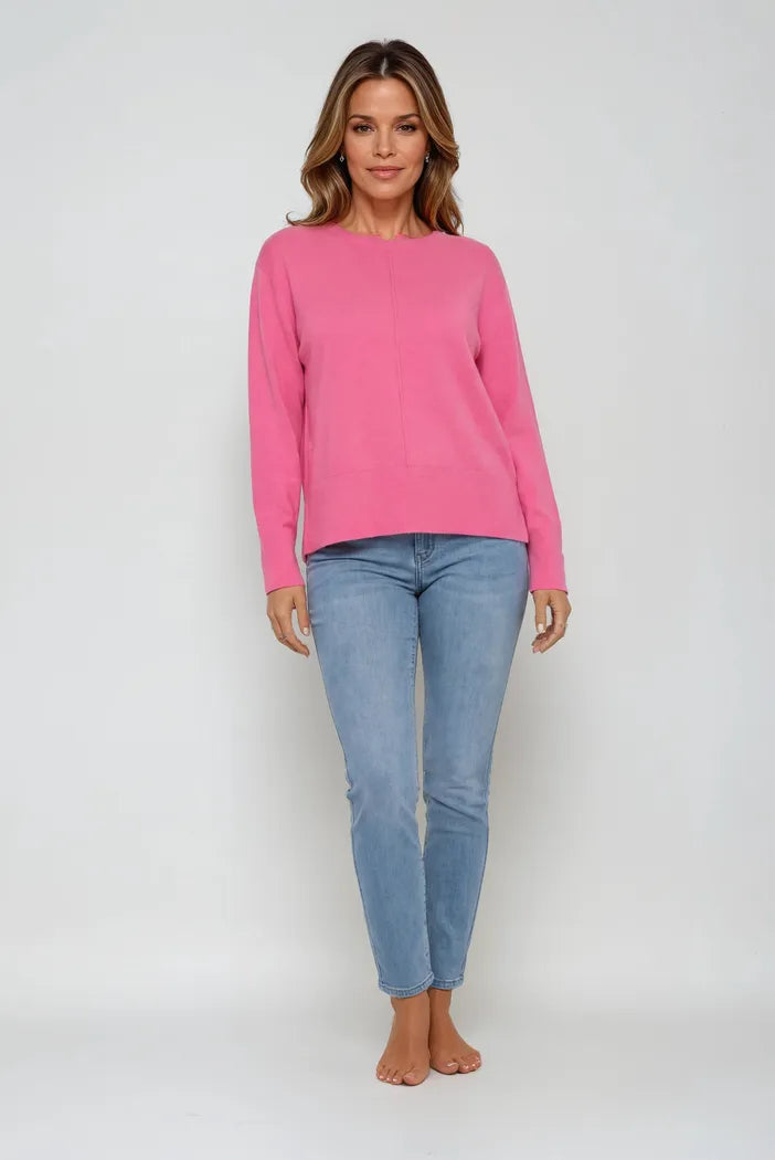 Rosa genser med rund hals, lange ermer og en søm som går nedover midten.