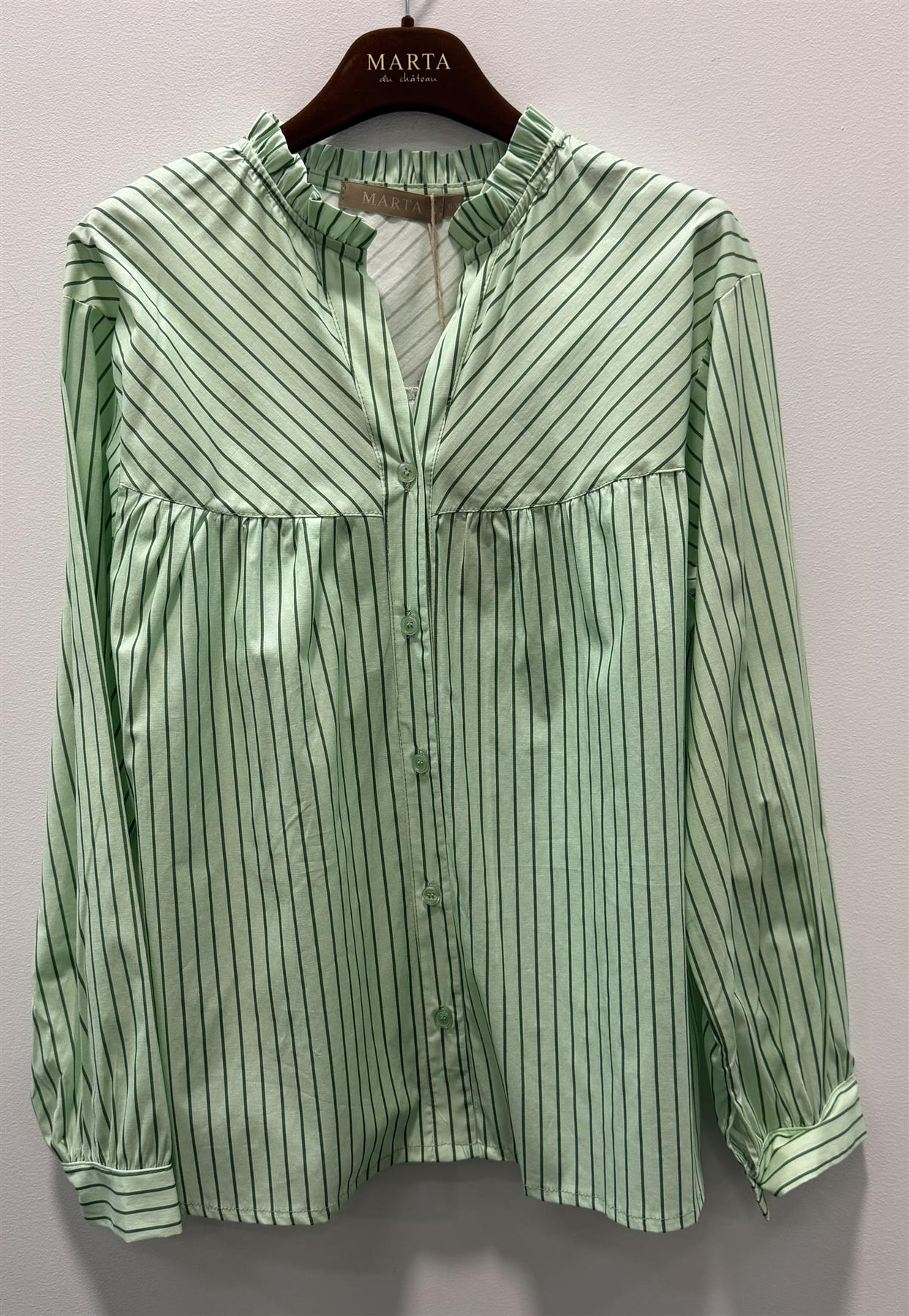 Grønn skjorte med vertikale og diagonale striper, rysjekrage og knapper foran.
