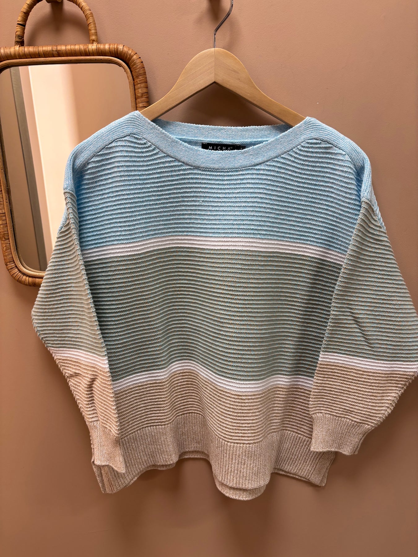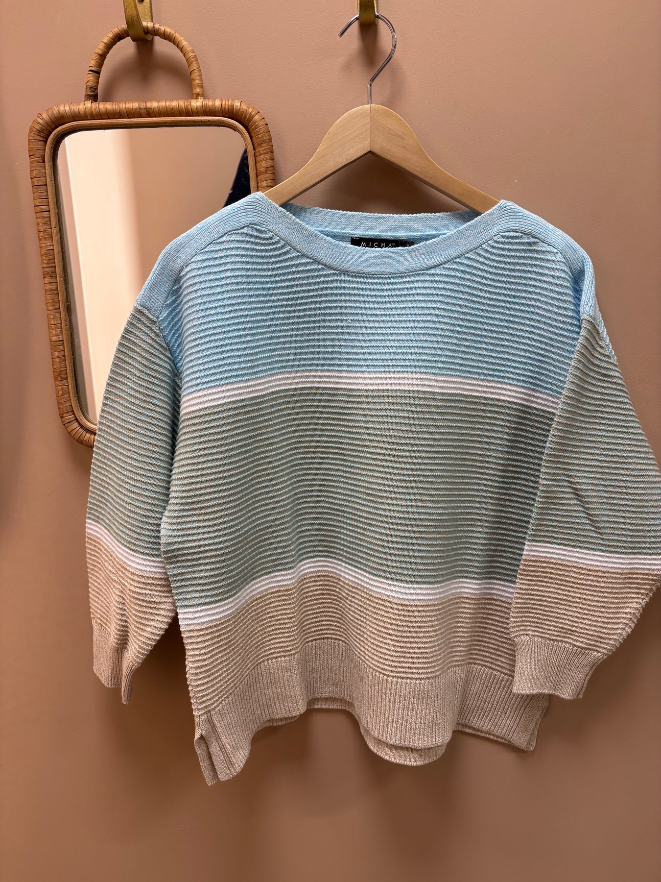 Stripete genser med lys blå, hvit og beige, henger på trehenger mot beige vegg med speil.
