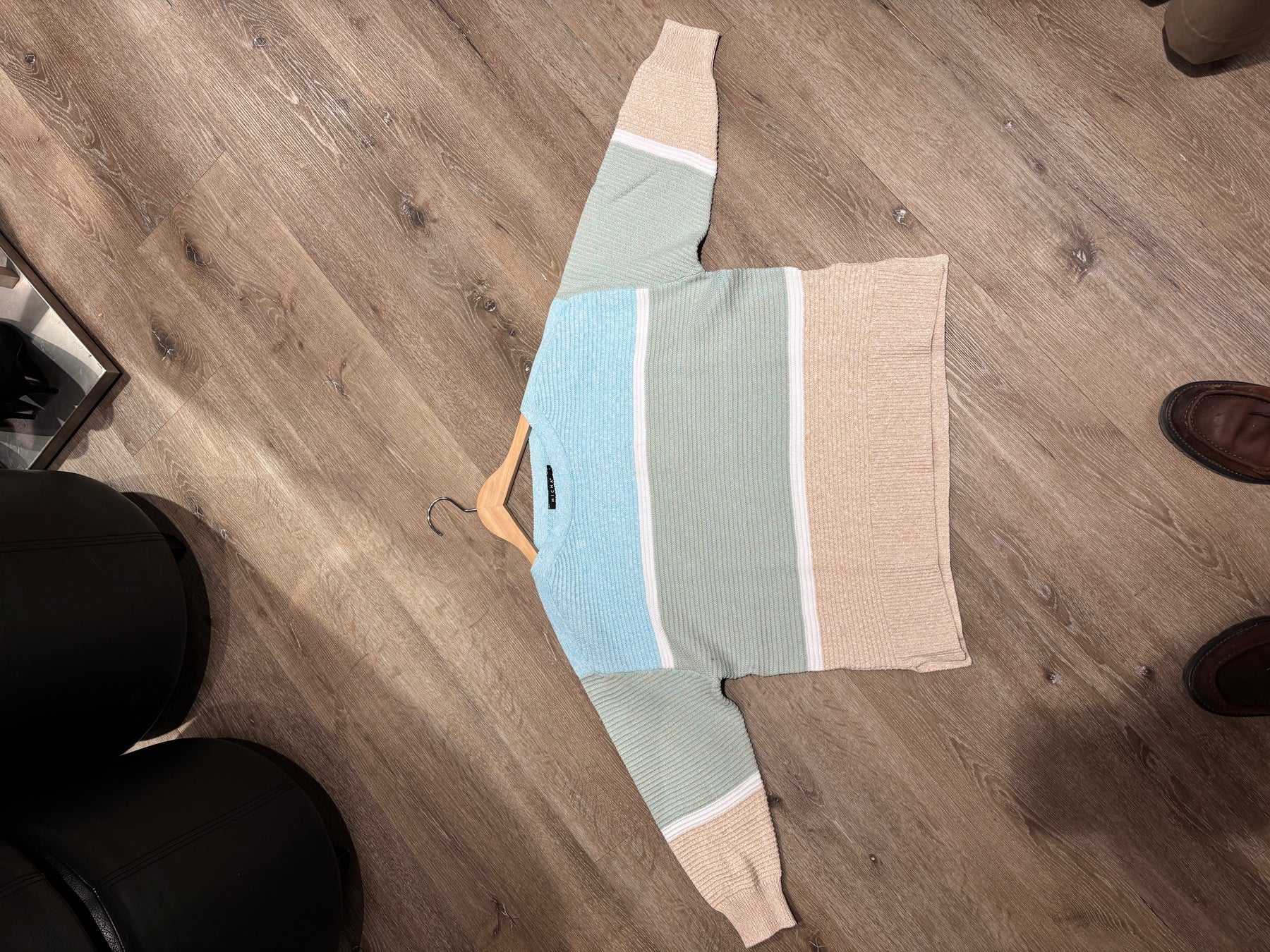 Stripet genser i beige, blå og grønn på tregulv, med skosåle til høyre.