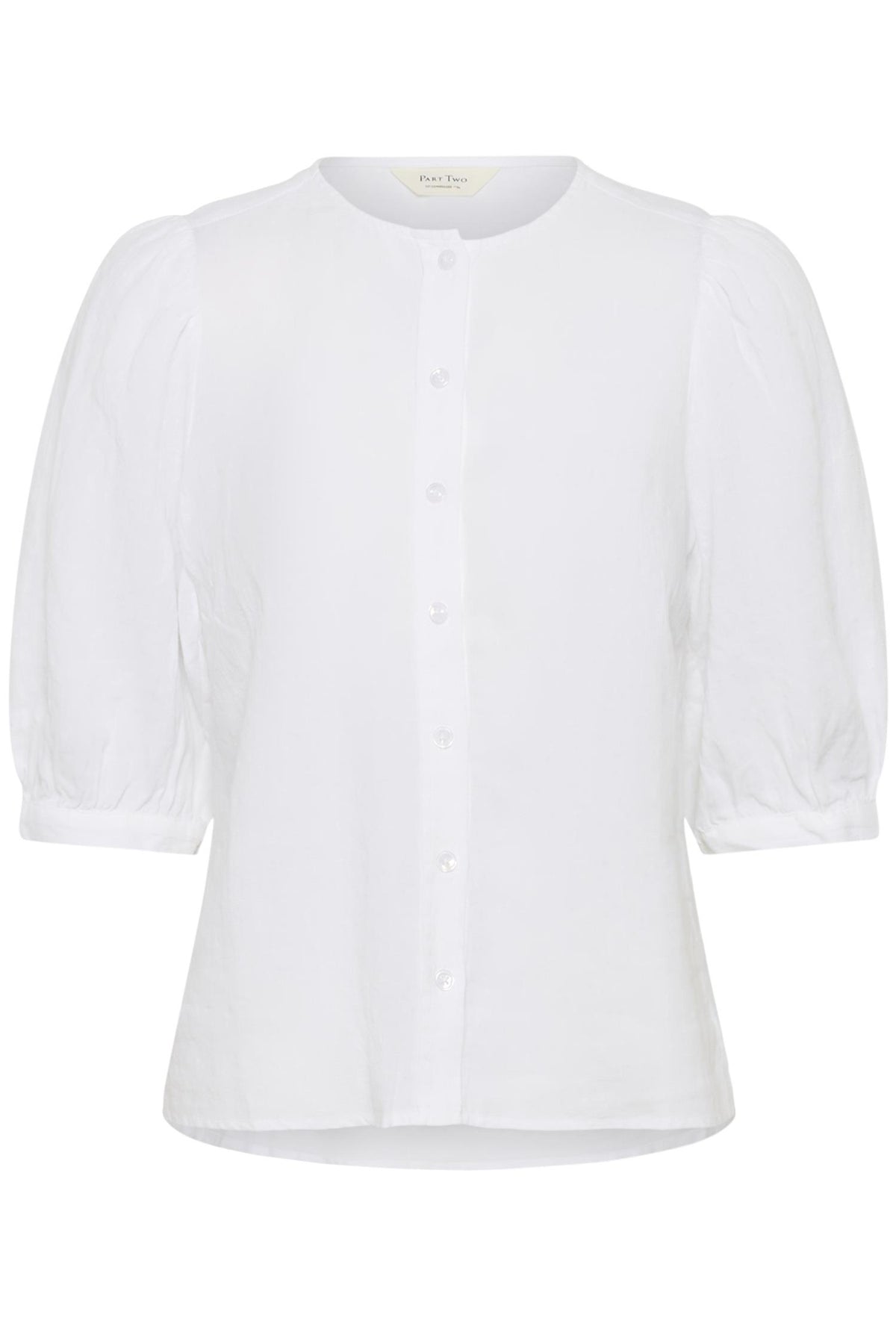 Hvit bluse med rund hals, trekvart ermer med knappdetaljer, og knappelukking foran.