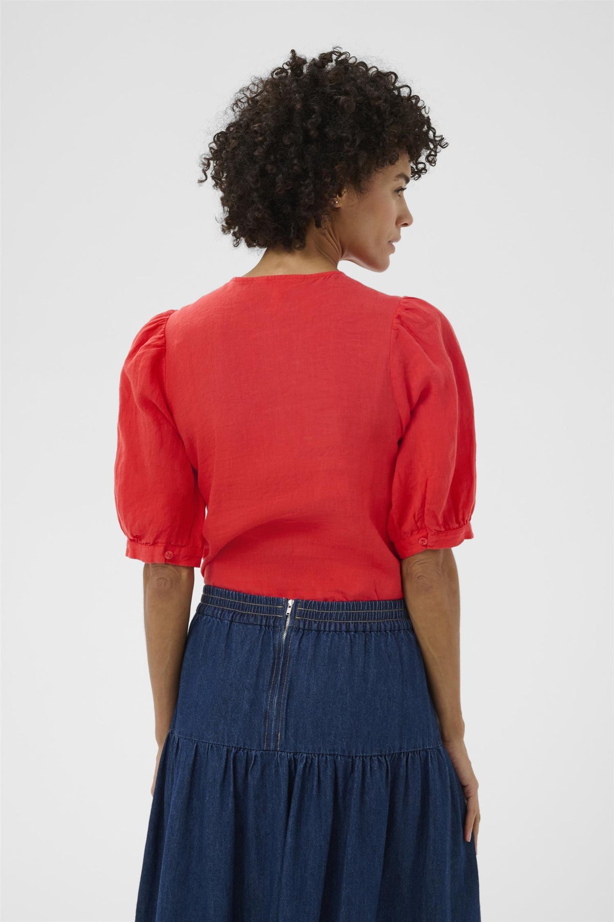 Den livlige røde nyansen gir blusen et friskt uttrykk som fungerer godt til både jeans og skjørt. Knappelukningen foran gjør den enkel å ta av og på, mens linens komfort gjør den behagelig gjennom hele dagen.