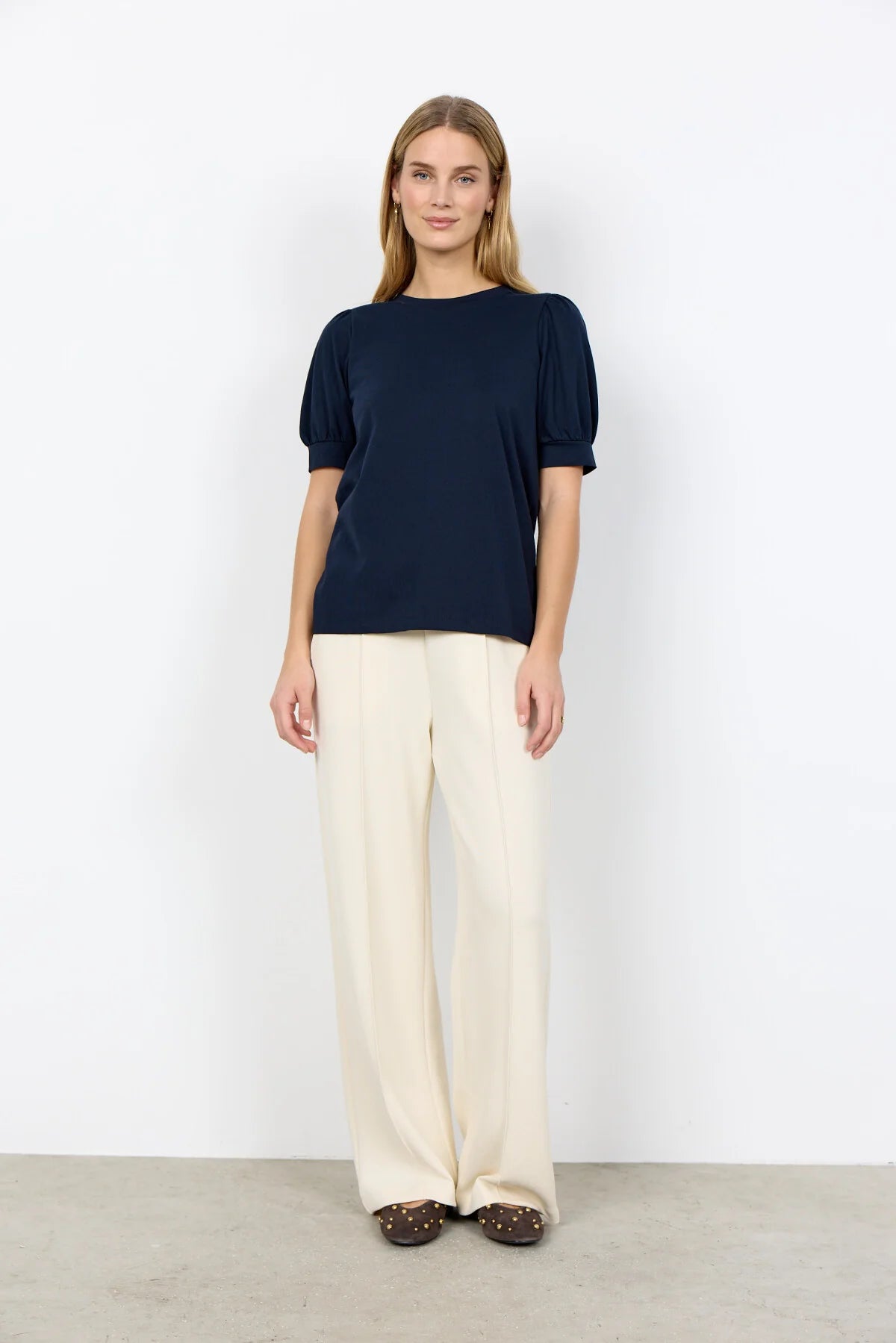 Mørk blå topp med puffede ermer og rund hals, kremfargede bukser og brune sko.
