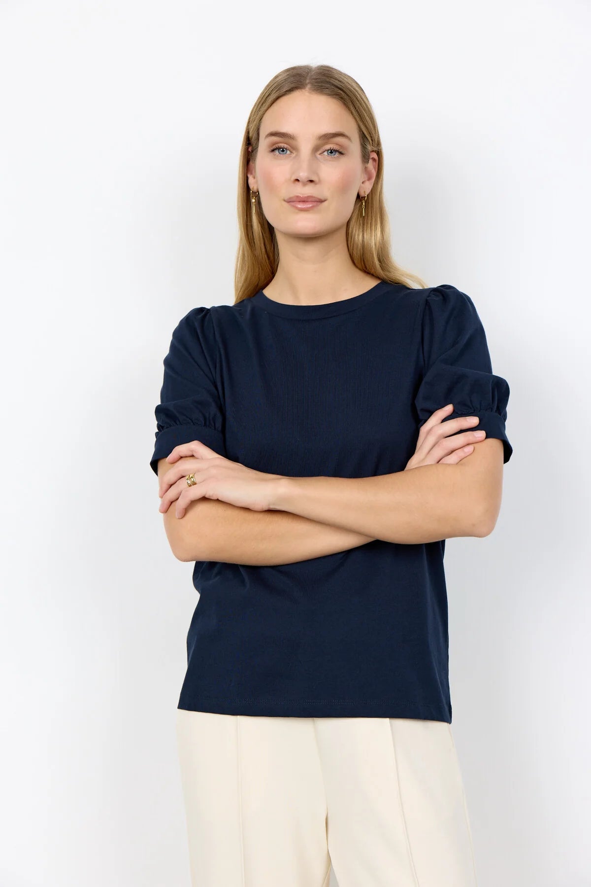 Kvinne i mørk blå topp med korte puffede ermer og rund hals, står med armene i kors.