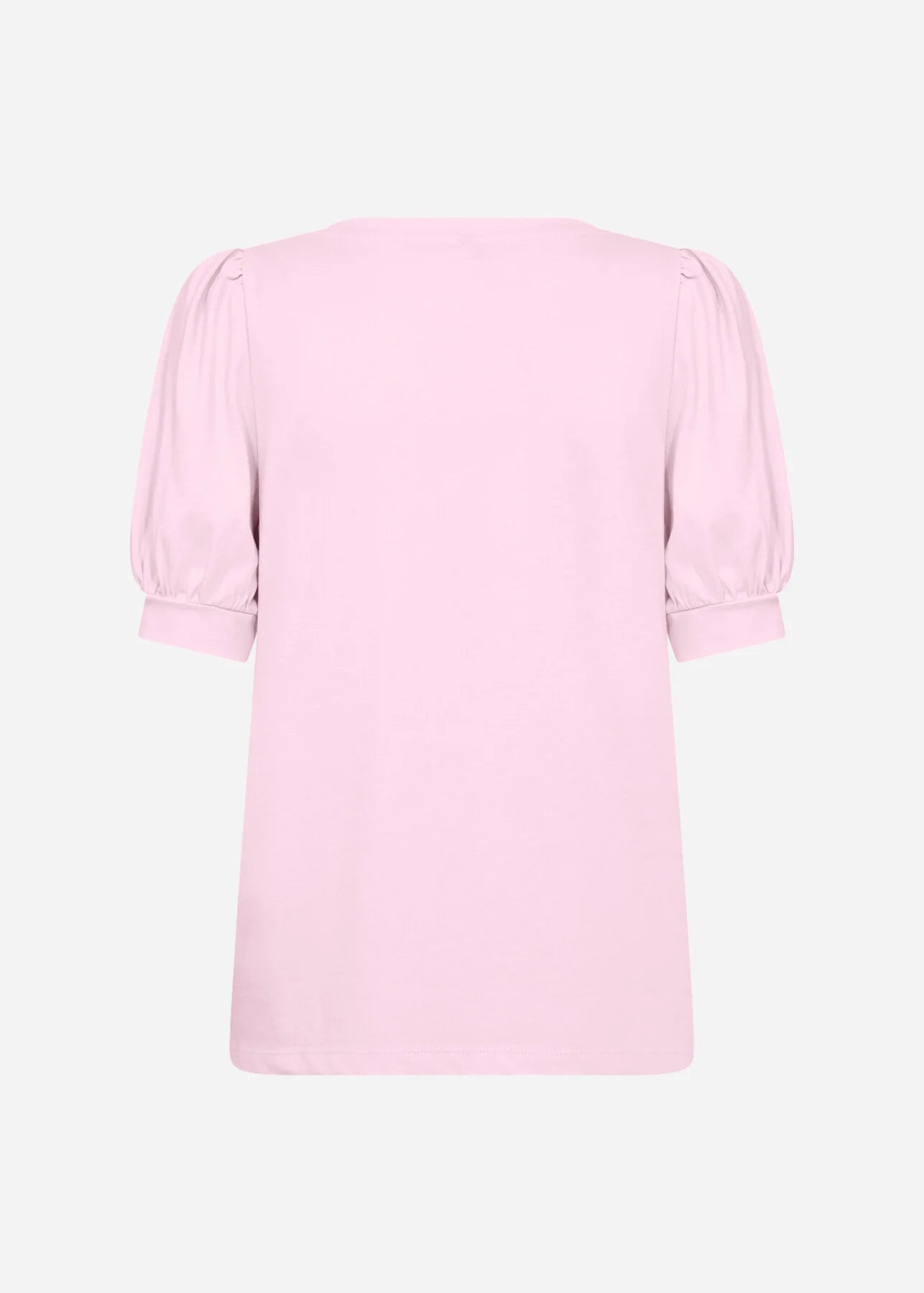 Im-Derby 158 fra Imprezz er en rosa t-skjorte med puffede ermer og rund hals. Den er laget av 100 % økologisk bomull, noe som gir en myk følelse mot huden. Materialet er produsert uten skadelige kjemikalier.