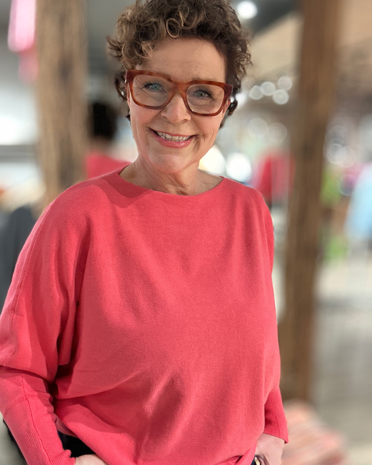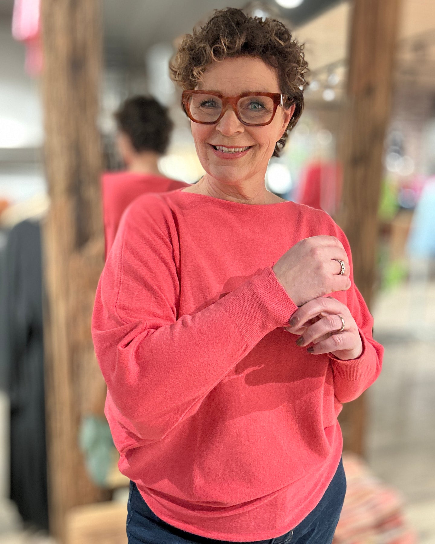 Person med rosa genser i løs passform og brede hals, smilende innendørs med uskarpt bakgrunn.