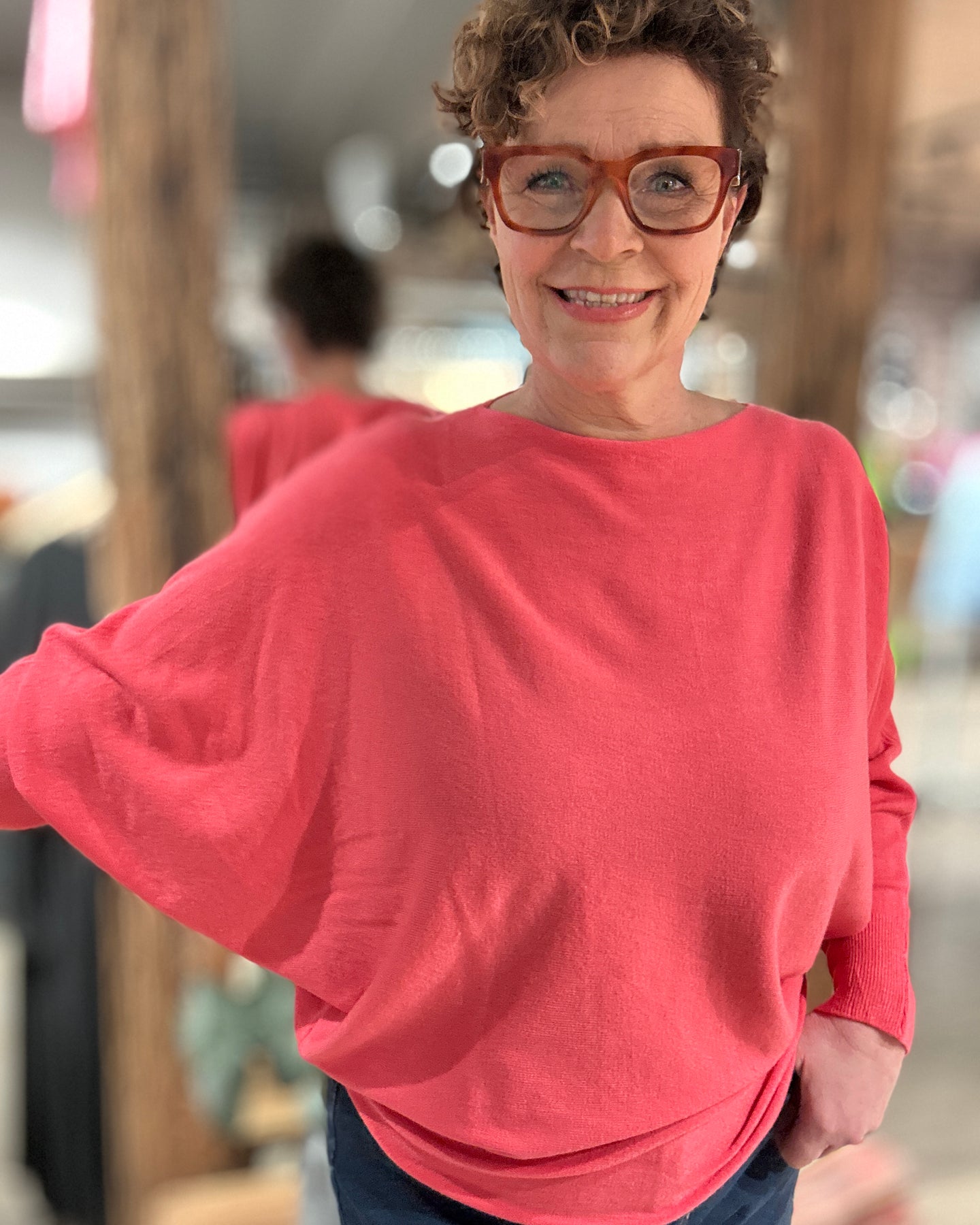 Person i rosa genser med løs passform, lange ermer og bred hals. Smiler vennlig.