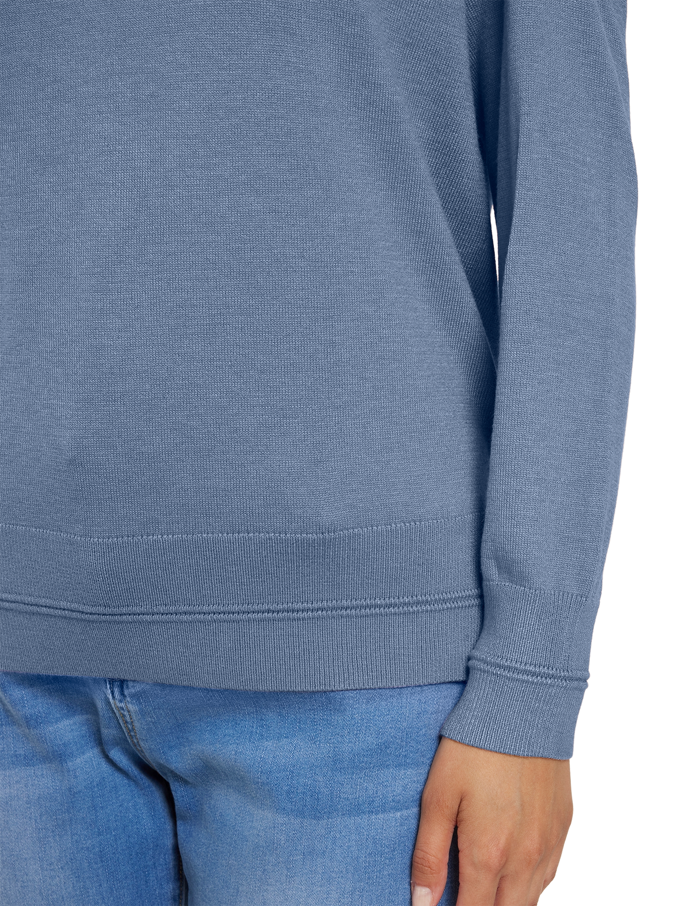 Blå pullover med rund hals, lange ermer, ribbestrikket kant, sammen med lyseblå jeans.