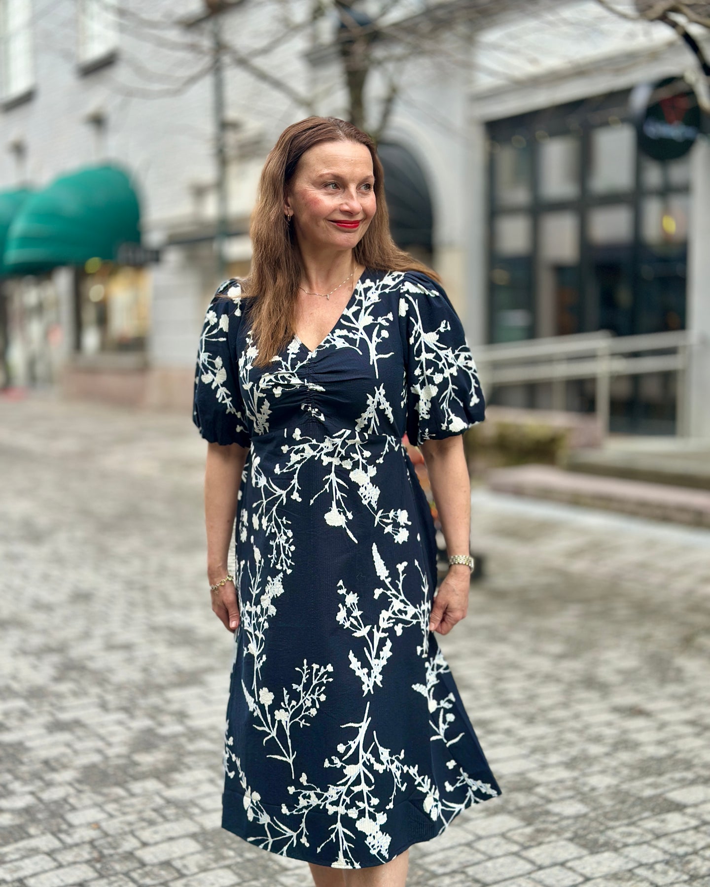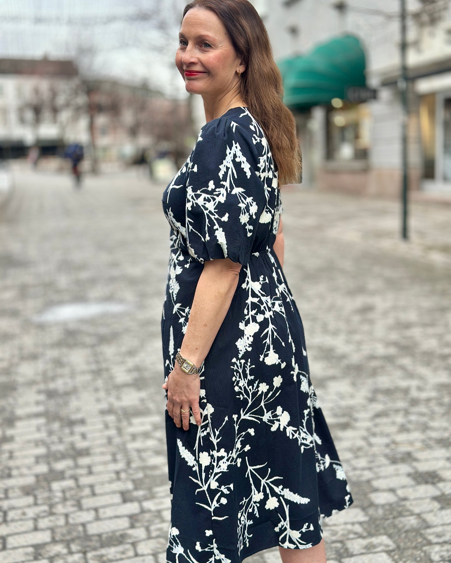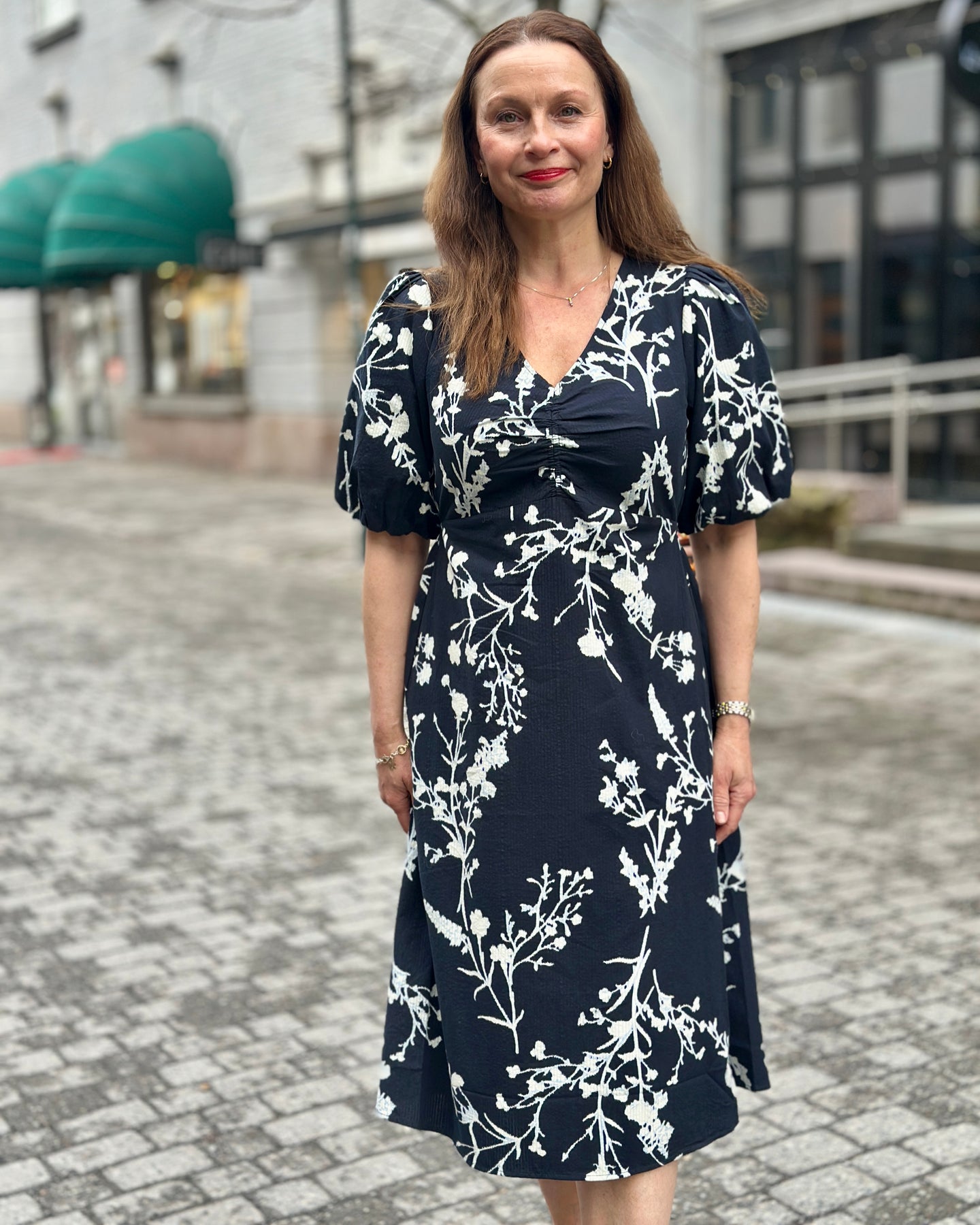Denne kjolen fra JENSEN har et lyst grønt blomstertrykk i hvitt som gir et moderne uttrykk. De korte, vide ermene og V-halsen med rynkedetaljer på brystet skaper en feminin silhuett som passer til ulike anledninger.