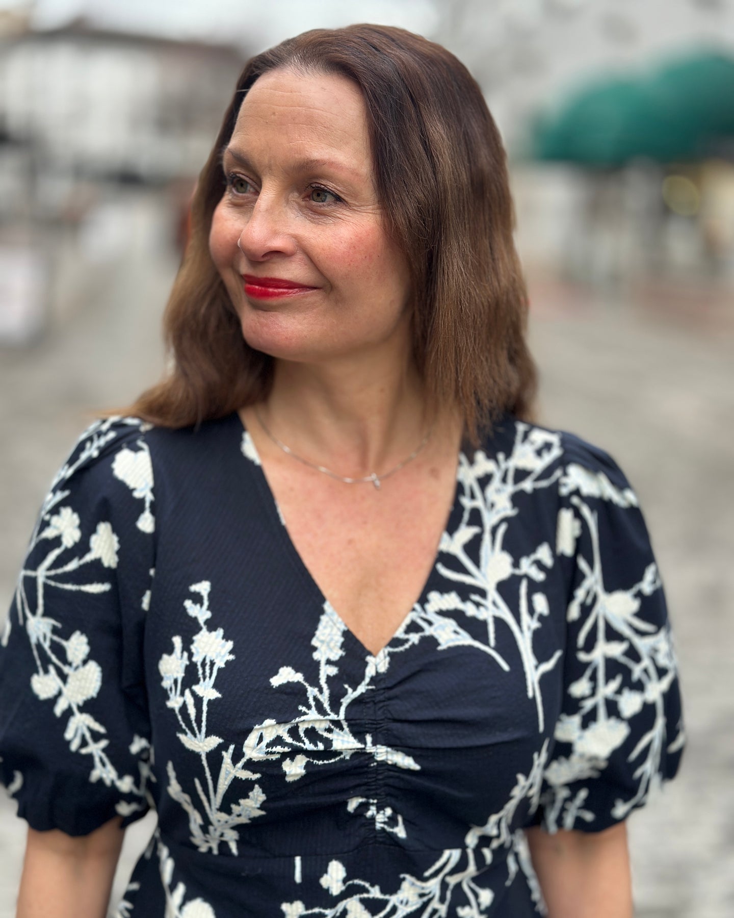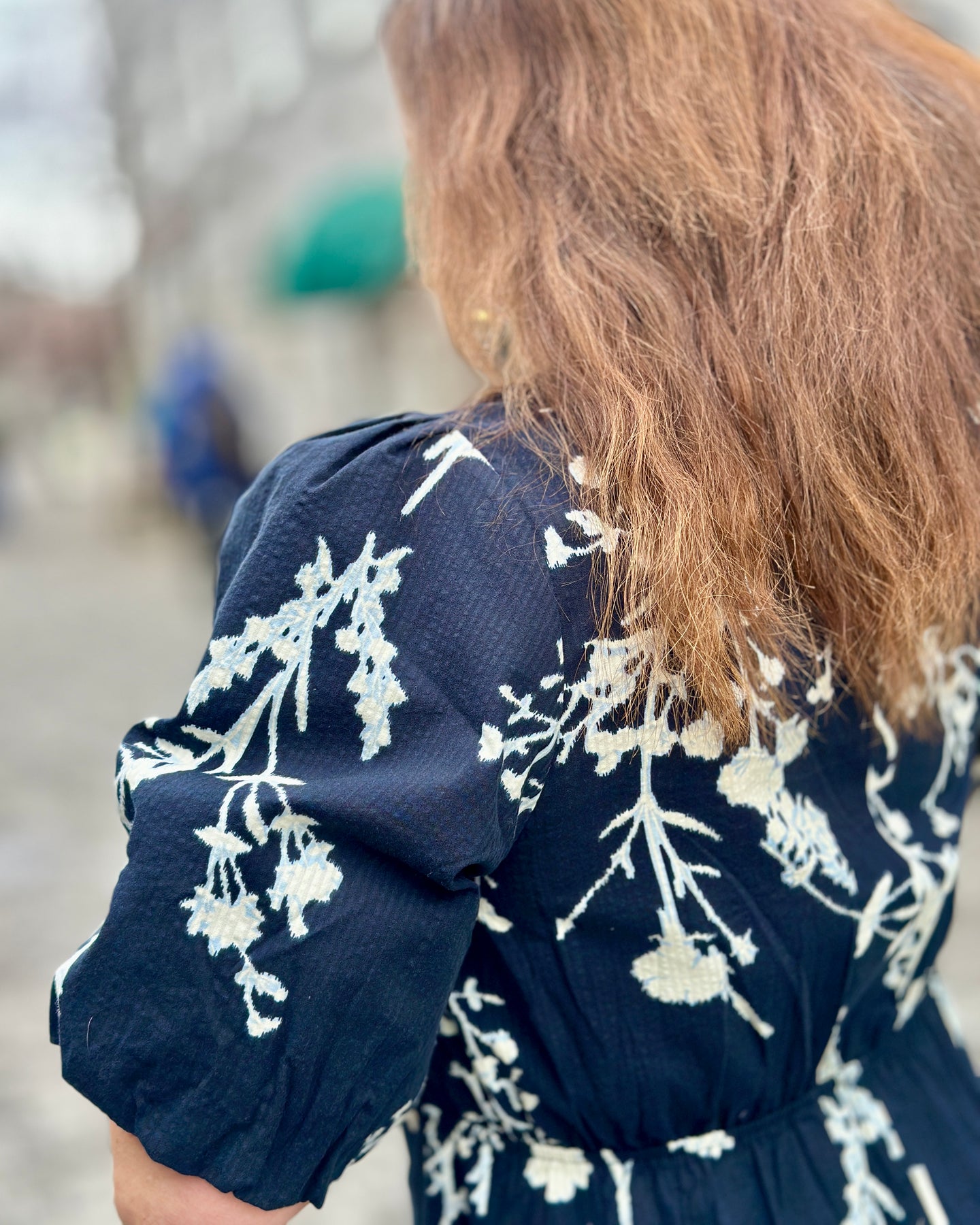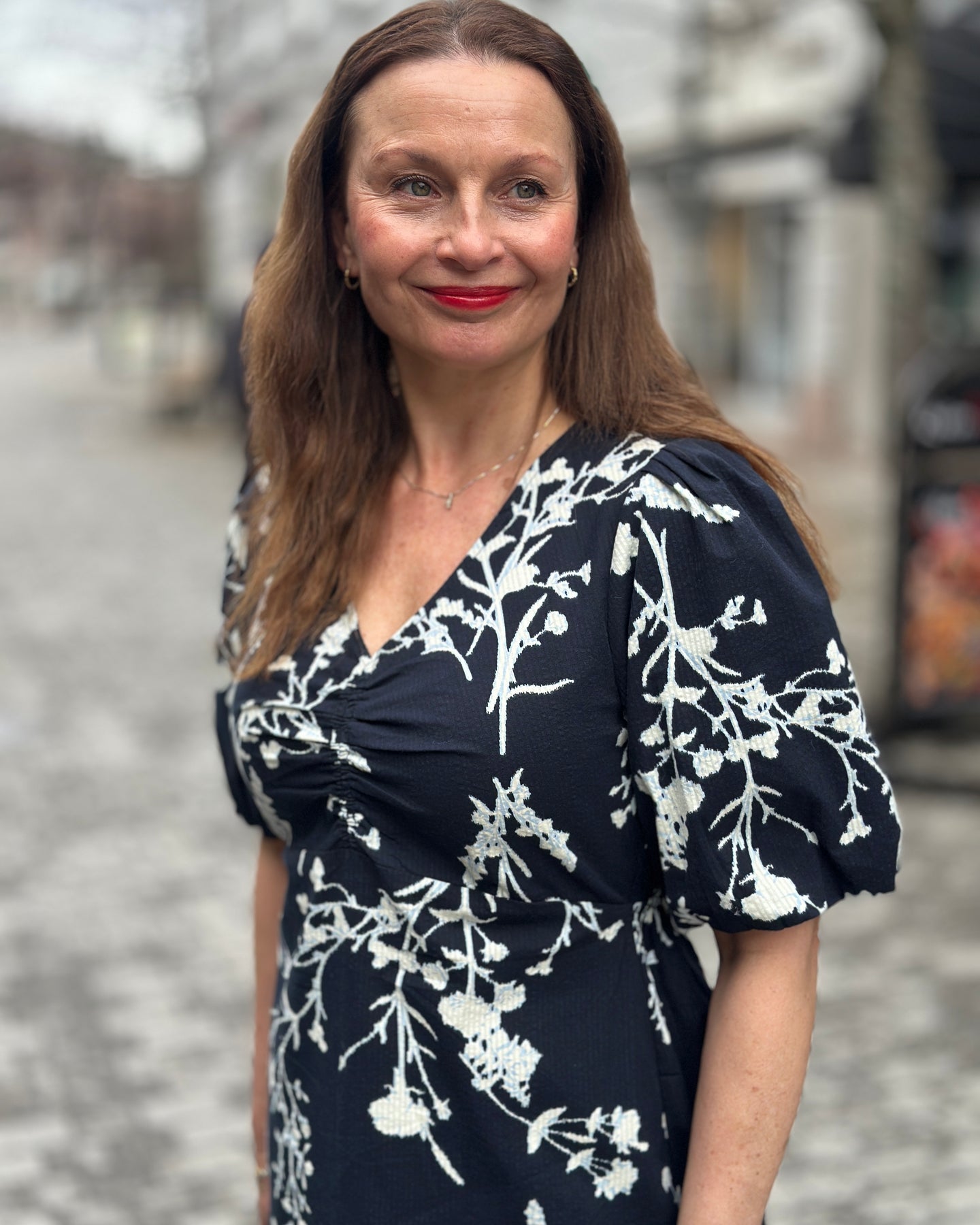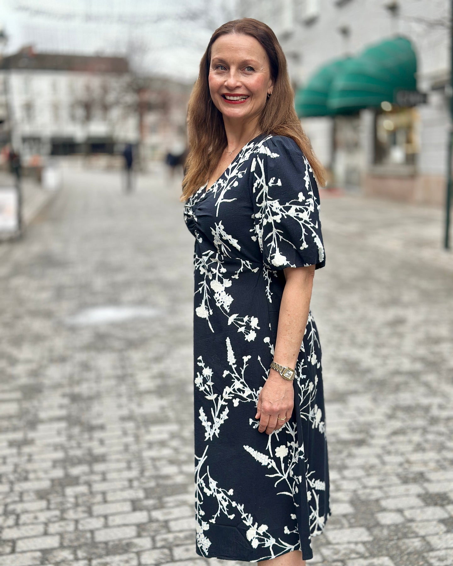 Denne kjolen fra JENSEN har et lyst grønt blomstertrykk i hvitt som gir et moderne uttrykk. De korte, vide ermene og V-halsen med rynkedetaljer på brystet skaper en feminin silhuett som passer til ulike anledninger.