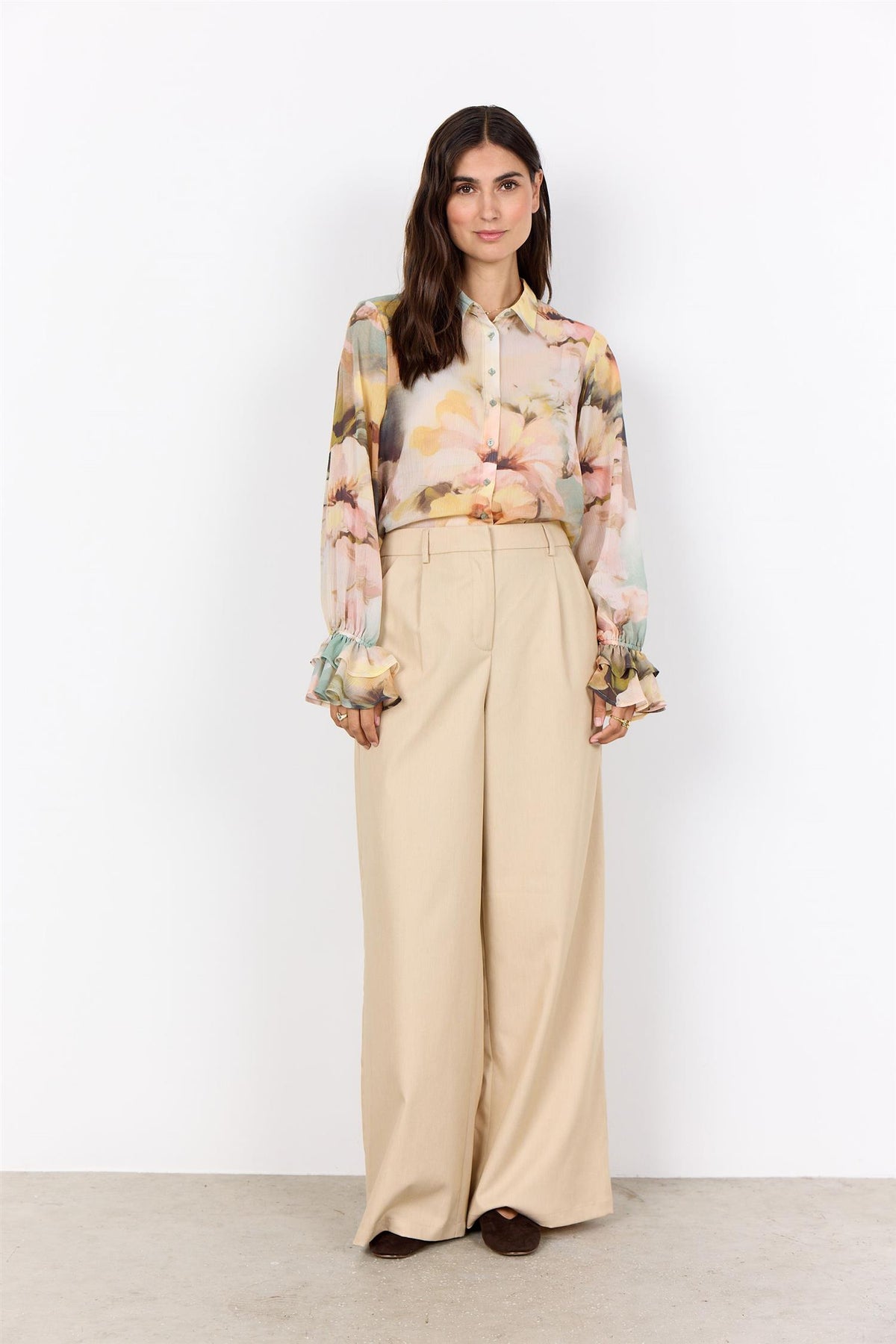 Bluse med blomsterprint, lange ermer med volanger, knappestolpe foran, beige bukser.