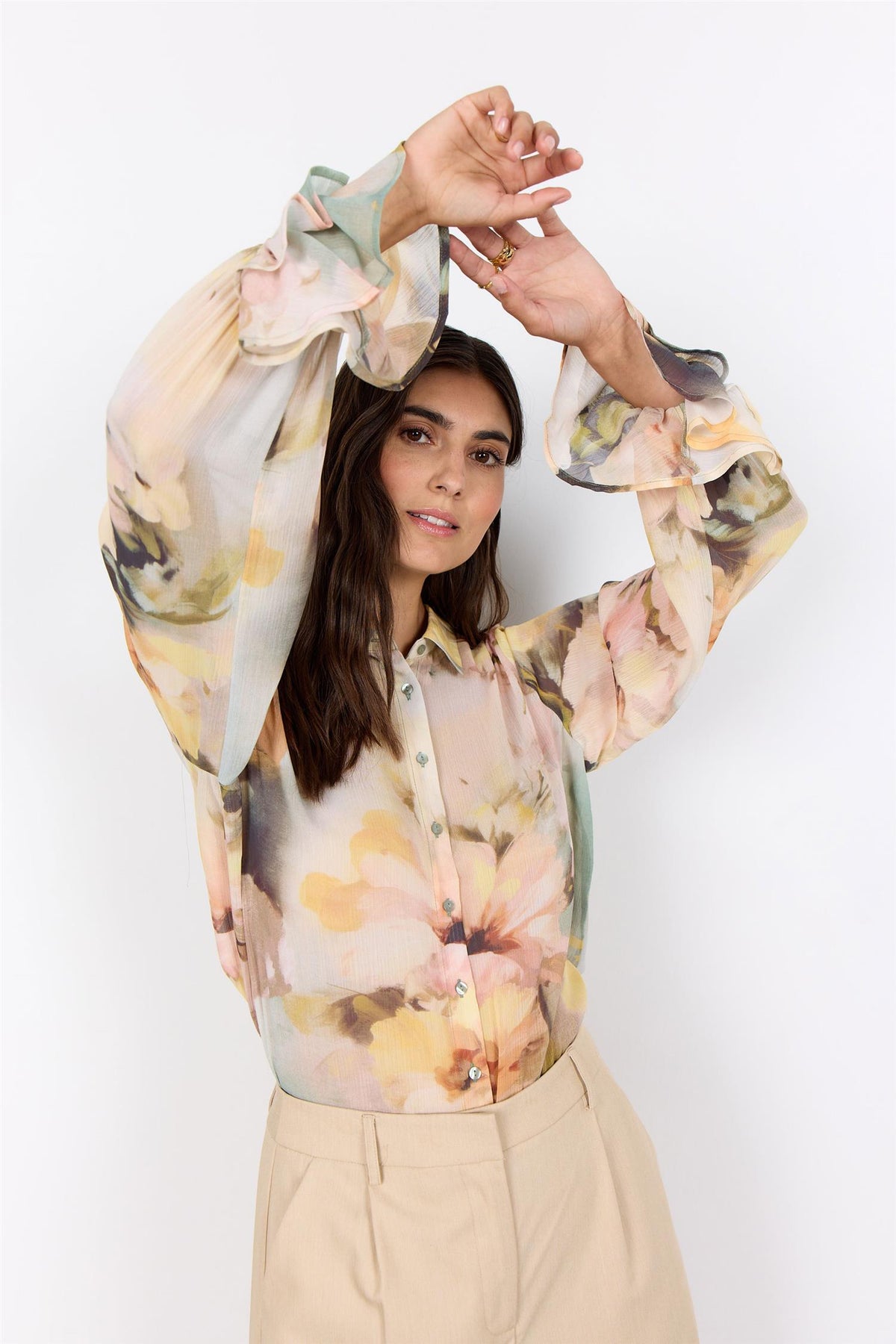 Bluse med blomsterprint, volanger på ermene, knappestolpe, beige bukse, modell står mot hvit bakgrunn.